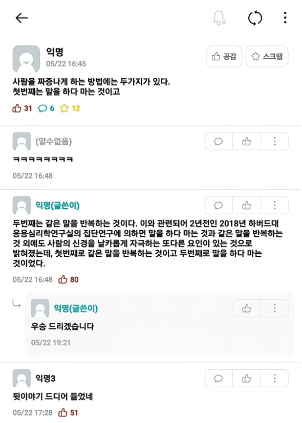 »ç¶÷À» Â¥Áõ³ª°Ô ÇÏ´Â ¹æ¹ý¿¡´Â ¼¼°¡Áö°¡ ÀÖ´Ù. ù¹øÂ°´Â ¸»À» ÇÏ´Ù ¸¶´Â°ÍÀ̰í, µÎ¹øÂ°´Â Çß´ø ¸»À» ¶Ç ÇÏ´Â °ÍÀÌ¸ç ¼¼¹øÂ°´Â ¿ï¶ó¸®