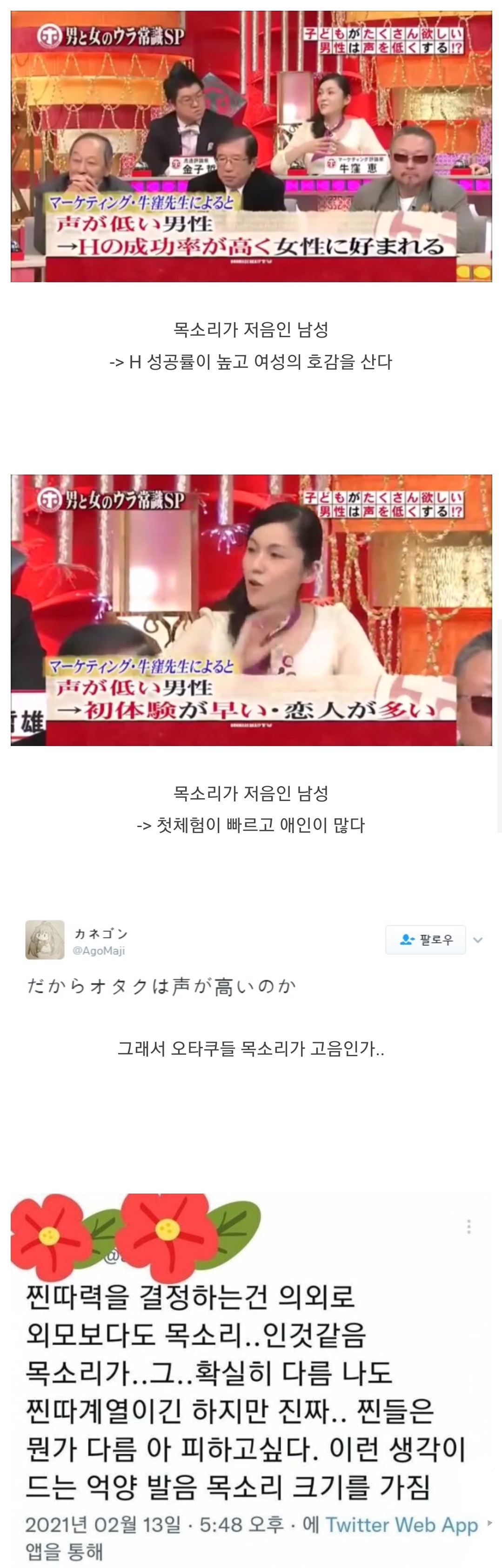 ¿¹Àü¿¡ ebs¿¡¼ ½ÇÇèÇß´ø °Í °°Àºµ¥.. ¸ñ¼Ò¸®°¡ ÀúÀ½ÀÎ ³²ÀÚ´Â ³²¼ºÈ£¸£¸ó ºÐºñ·®ÀÌ ³ôÀ» È®·üÀÌ ³ô´Ù°í ±×·¨À½.. ±×·¡¼ º»´ÉÀûÀ¸·Î ¿©ÀÚµéÀÌ ²ø¸®´Â °Å¶ó°í.. ¹¹ °³ÀÎÂ÷´Â ÀÖ°ÔÁö¸¸ º¸Åë ±×·¸´Ù°í ÇÔ.