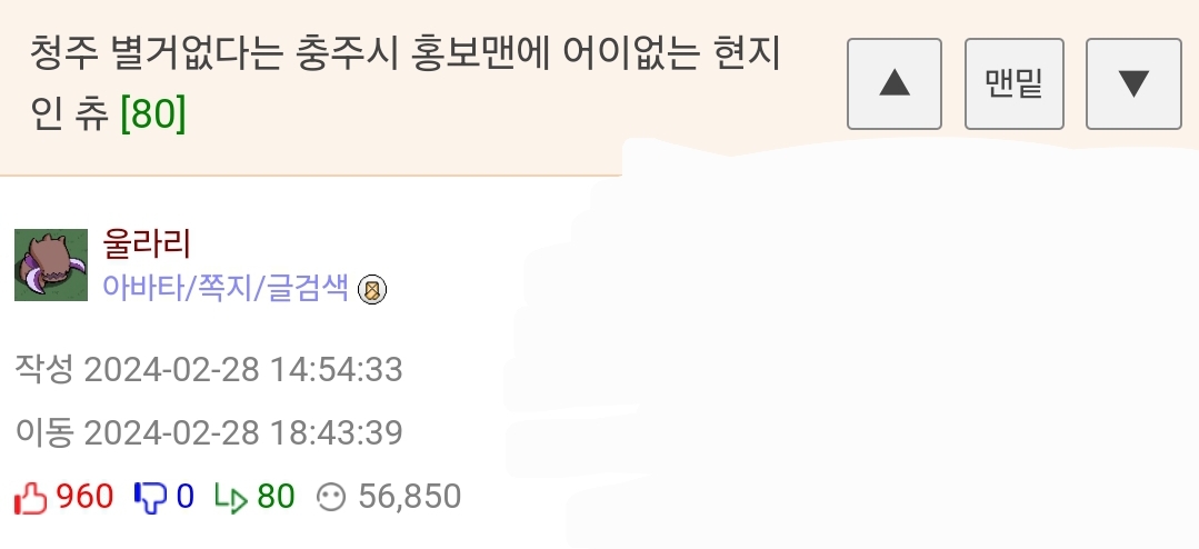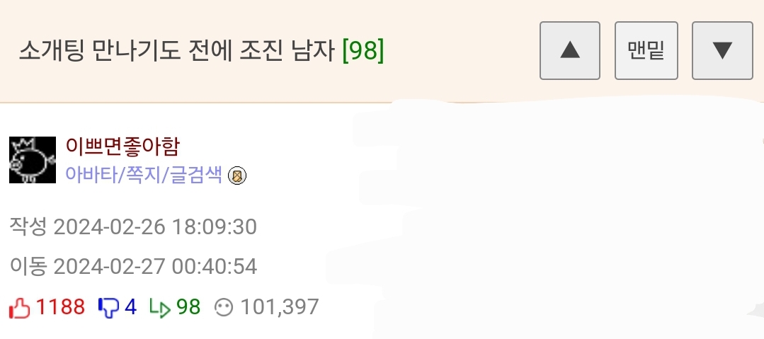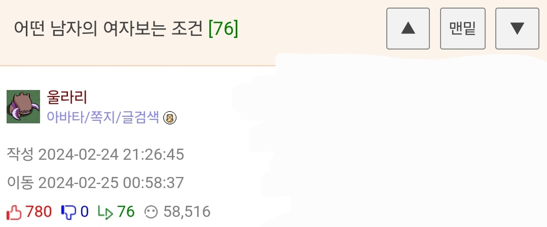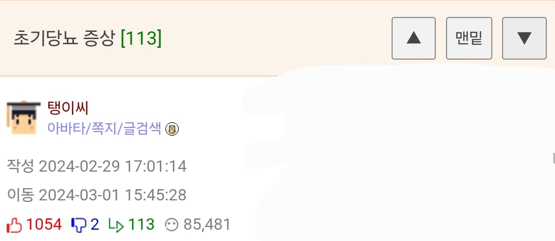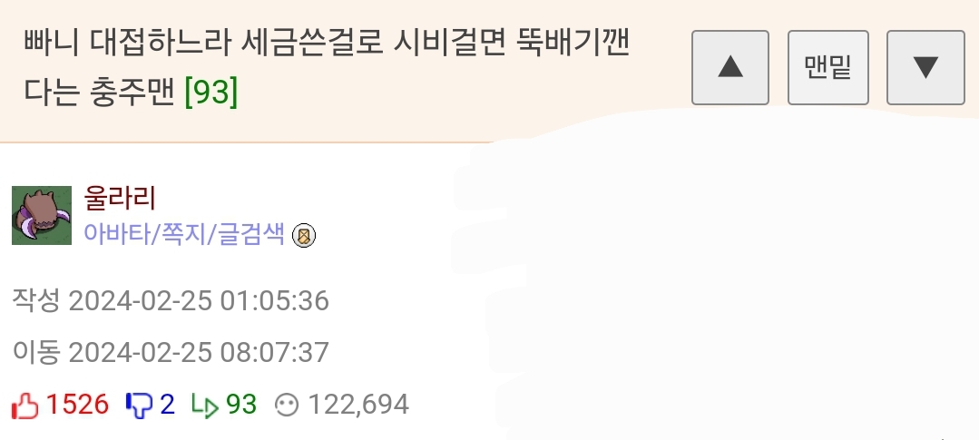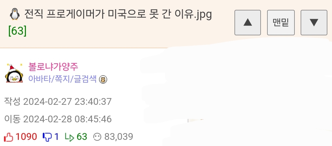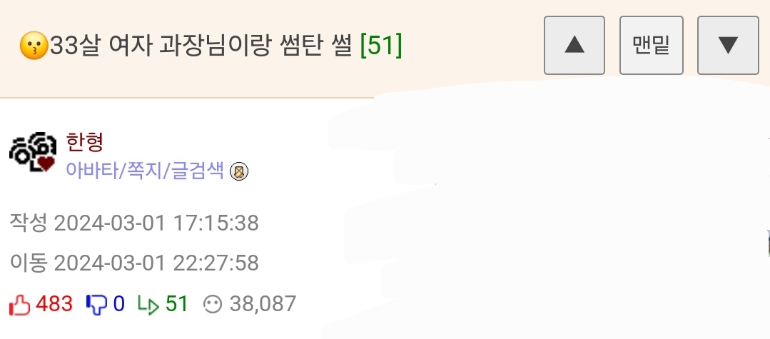¹øÈ£ 1292898 Ãßõ 358 ¹Ý´ë 0 ´ä±Û 14 Á¶È¸ 17,569 ÀÛ¼º½Ã°£ 2024-03-03 11:04:48 À̵¿½Ã°£ 2024-03-03 11:47:44