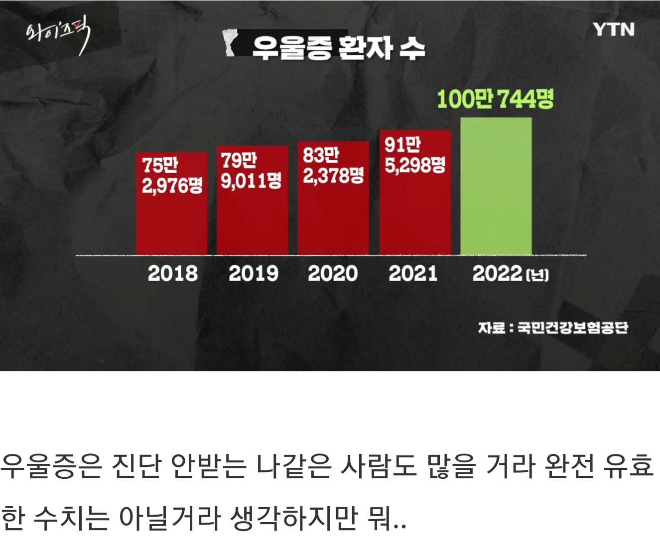 ¿ÀÇØÇÏ½Ã¸é ¾ÈµÇ´Â°Ô ¿ì¿ï°¨À̶û ¿ì¿ïÁõÀº ±¸ºÐÇÏ¼Å¾ßµÊ ¿ì¿ï°¨Àº ¸»±×´ë·Î °¨Á¤ÀÌ¶ó ±¹¹ÎÀÇ 90ÆÛ°¡ ´À³¥ ¼öµµ ÀÖÁö¸¸ (¹°·Ð ±×°Íµµ Á¤»óÀûÀÎ ³ª¶ó´Â ¾Æ´Ô) ¿ì¿ïÁõÀº Áúº´À̶ó¼ 100¸¸¸í¸¸ µÅµµ ½É°¢ÇÏ°Ô ¸¹Àº ¼öÁØÀÓ ¹°·Ð °Ë»ç ¹ÞÁö ¾ÊÀº »ç¶÷µé Æ÷ÇÔÇØ¼ 100¸¸º¸´Ü ÈξÀ ¸¹À» °Å °°±äÇѵ¥ 1000¸¸¸íÀº µÉ °Å¶ó´Â °Ç ³Ê¹« ¾ïÃøÀεí