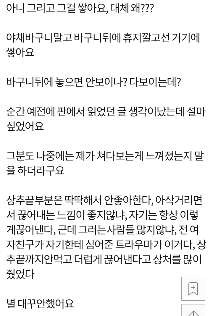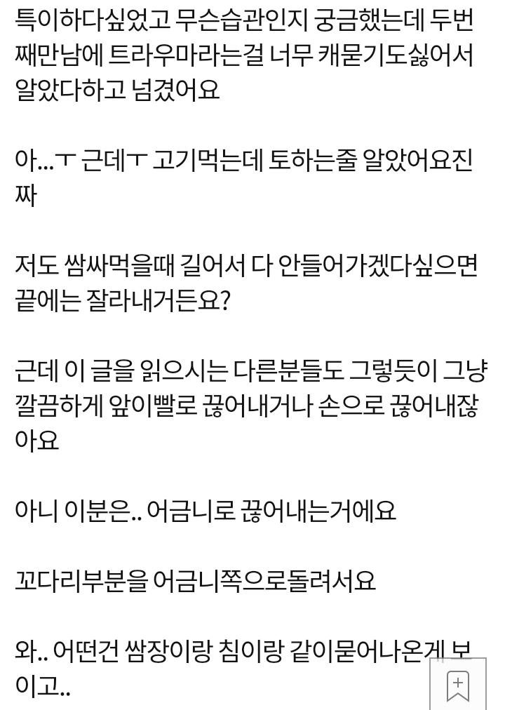 Àú°Å Àß ÀÌÇØ¾ÈµÇ´Â »ç¶÷µé ÀÖÀ»ÅÙµ¥, Àú·± »ç¶÷ ½ÇÁ¦·Î ¸ñ°ÝÇÑ»ç¶÷À¸·Î¼ ¼³¸íÇØº¸ÀÚ¸é, ³ª¸¦ Æ÷ÇÔÇÑ º¸ÅëÀº »óÃ߸¦ Áý¾îµé¾î¼ ²¿´Ù¸®¸¦ ¼ÕÀ¸·Î Àß¶ó³½ ´ÙÀ½ »óÃßÀ§¿¡ ½ÓÀ» ½Î¼ ½Î¸ÔÀ½. ±Ùµ¥ ³» Àü Á÷Àå»ó»ç°¡ ¾î¶»°Ô ¸Ô¾ú³Ä¸é »óÃ߸¦ ±×´ë·Î Áý¾îµçä ±×»óÅ¿¡¼ »óÃßÀ§¿¡ ½Ó½Ò°Å¸®´Ã ¿Ã¸®±â½ÃÀÛÇÑ´ÙÀ½ ½ÓÀ» ½Ñä ²¿´Ù¸®ºÎºÐ¸¸ ÀÔ¹Û¿¡ ³²±ää ½ÓÀ» ÀÔ¿¡ ³Ö°í ¾Ã±â½ÃÀÛÇÔ. ¸î¹ø ¾Ã´Ù°¡ ²¿´Ù¸®¸¸ Åö ¹ñ¾î³»´Âµ¥ ±× ²¿´Ù¸® ²÷¾îÁø ºÎºÐÀº ¹ÝÂë ÀÔ¼Ó¿¡ ÀÖ´Ù ³ª¿Â°Å¶ó ¹äÇ®ÀÌ¸ç ½ÓÀåÀÌ¸ç ¹¯¾îÁøÃ¤ÀÓ¤»¤» ±×°É »óÀ§¿¡ ´øÁ®³õÀ¸´Ï ÁøÂ¥ ³ ºñÀ§ °ÇÑÆíÀ̶ó »ý°¢ÇÏ°í »ì¾Ò´Âµ¥µµ ÀÔ¸À ¶Ò¶³¾îÁü¤»¤»¤» [5]