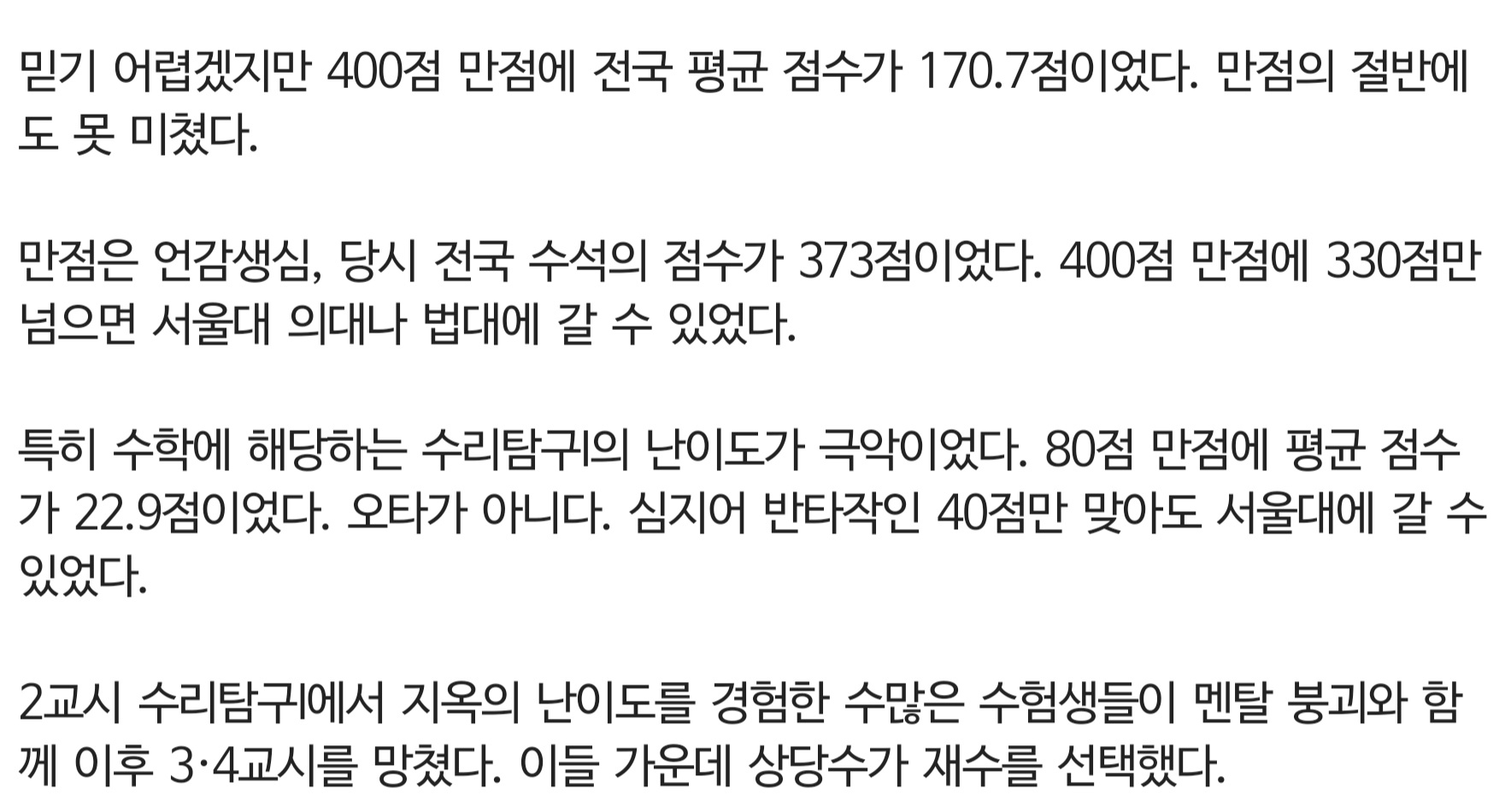 ¼öÇÐÀº Á¡Â÷ ¹üÀ§°¡ ÁÙ¾îµé°í, ¿µ¾î´Â Àý´ëÆò°¡·Î ¹Ù²î¾ú°í, ޱ¸°ú¸ñÀº ¹®À̰ú ¹× °ú¸ñ º° Ç¥ÁØÁ¡¼ö ÆíÂ÷°¡ ³Ê¹« Å©´Ùº¸´Ï, ù ½ÃÇèÀº ¸àÅ» ±úÁöÁö ¾Ê°Ô ÇØ¾ß ÇÑ´Ù´ø ¿¾³¯°ú ´Þ¸® ±¹¾î¿¡ º¯º°·ÂÀ» ÀÚ²Ù ³Ö°Ô µÊ. ±Ùµ¥ ¿À´ä·ü 82%À̸é Âï´Â°Å³ª Ǫ´Â°Å³ª È®·üÀÌ °°´Ù´Â°Å¶ó ½É°¢ÇÏ°Ô À߸ø ¸¸µç ¹®Á¦.