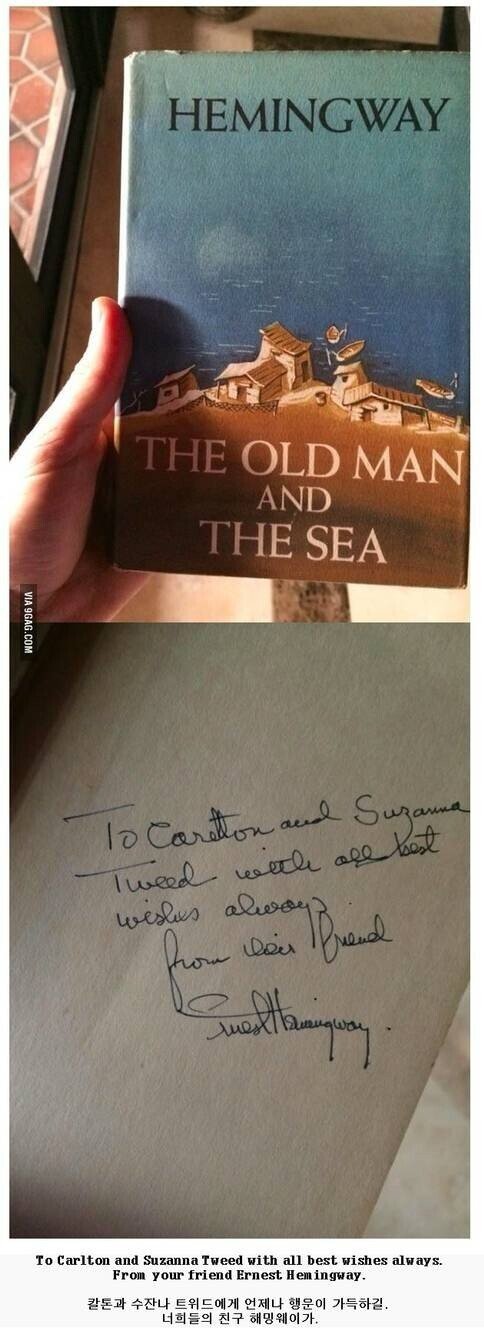 [ºÎ¿¬¼³¸í] Ã¥¿¡´Â "To Carlton and Suzanna Tweed with all the best wishes always Ernest Hemingway." (Įư°ú ¼öÀܳª Æ®À§µå¿¡°Ô ¾ðÁ¦³ª Çà¿îÀÌ °¡µæÇϱæ. ³ÊÈñµéÀÇ Ä£±¸ Çì¹Ö¿þÀ̰¡.) ¶ó°í ÀûÇô ÀÖ¾ú´Ù. Įư°ú ¼öÀܳª ºÎºÎ´Â Ç÷θ®´Ù ÄÚ·² °ÔÀ̺íÁî¿¡ »ì¾Ò´Âµ¥ ¹Ù·Î ¿·ÀÌ Çì¹Ö¿þÀÌÀÇ ¼¶À¸·Î ºÒ¸®´Â ±×ÀÇ »ý°¡ÀÌÀÚ ±×°¡ ¸ðÈ÷¶Ç¸¦ ¸¶½Ã¸é¼ ³ëÀΰú ¹Ù´Ù¸¦ ÁýÇÊÇÑ °÷À̾ú´Ù°í ÇÑ´Ù. ¼öÀܳª Æ®À§µå´Â Áö¿ª À¯Áö¿´À¸¸ç 1999³â¿¡ Àڳฦ °®Áö ¸øÇÑ Ã¤ ¼¼»óÀ» ¶°³µÀ¸¸ç 1994³â¿£ ´ëÇÐ ÁøÇÐÀÌ ¾î·Á¿î ÇлýµéÀ» µ½´Â Àç´ÜÀ» ¸¸µé¾ú´Ù°í ÇÑ´Ù. ³²ÆíÀΠĮưÀº ±â°è°øÇÐÀÚ¿´À¸¸ç ³¬½Ã¸¦ ¾öû ÁÁ¾ÆÇß´Ù°í Çϴµ¥, ½Ã±â¿Í Á¤È²»ó ÀÌ ºÎºÎ°¡ Çì¹Ö¿þÀÌÀÇ ÁöÀÎÀ̾úÀ» °¡´É¼ºÀÌ ÃæºÐÈ÷ ³ô´Ù°í ÇÑ´Ù.