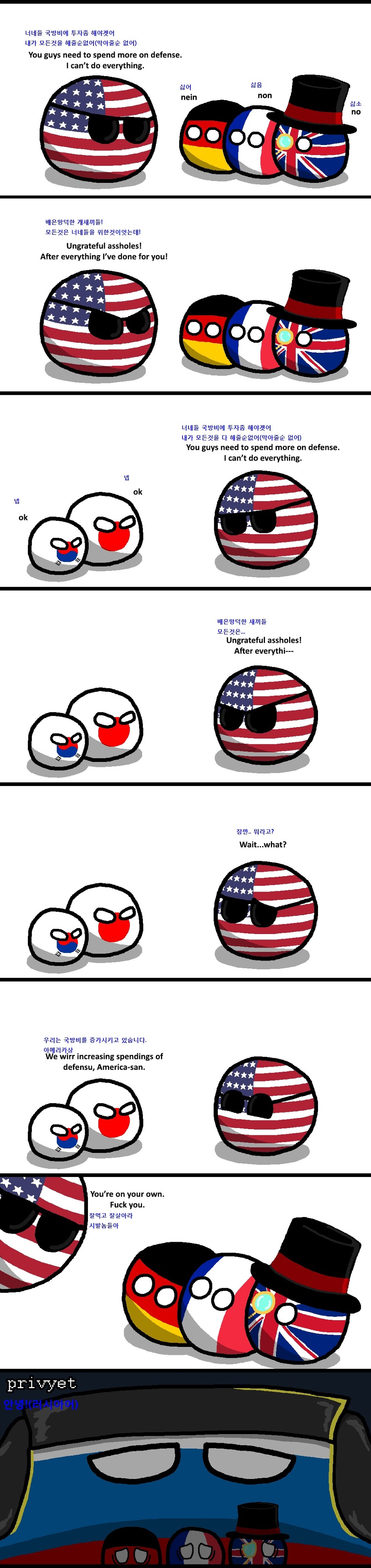 Çѱ¹ : ¿ì¸®µµ ½á¾ßÇÏ´Ï Àû´çÈ÷ »ç°¡¼¼¿ä. / Æú¶õµå : ¹¹¿ä? ¾²´Â ¹«±â¸¦ ÆÇ´Ù°í? ´õ ÁֽÿÀ.