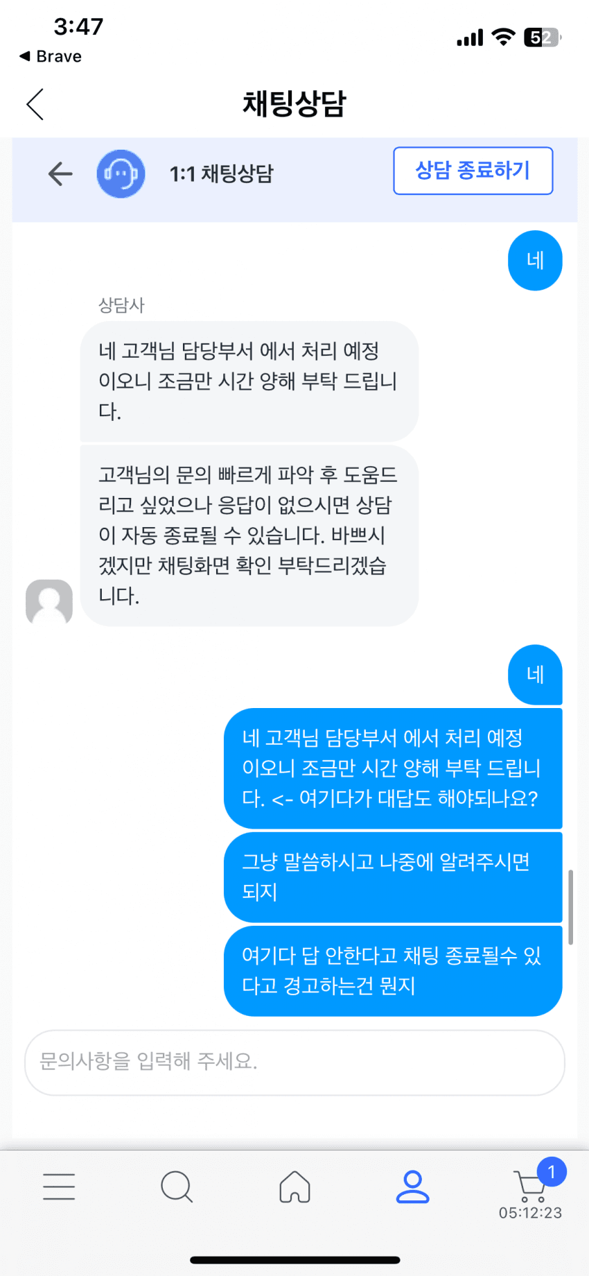 »ó´ã»ç ÂÊ¿¡¼ È®ÀÎÇÏ°Ú´Ù°í ±â´Ù·Á´Þ¶ó°í ¾È³»ÇÑ °æ¿ì´Â ³»°¡ ´ä ¾ÈÇß´Ù°í ÀÚµ¿Á¾·á ¾È µÇ´øµ¥ Ãʺ¸¶ó Á¾·áÁö¿¬ °°Àº°Å °Å´Â°É Àذųª ÇßÀ»µí