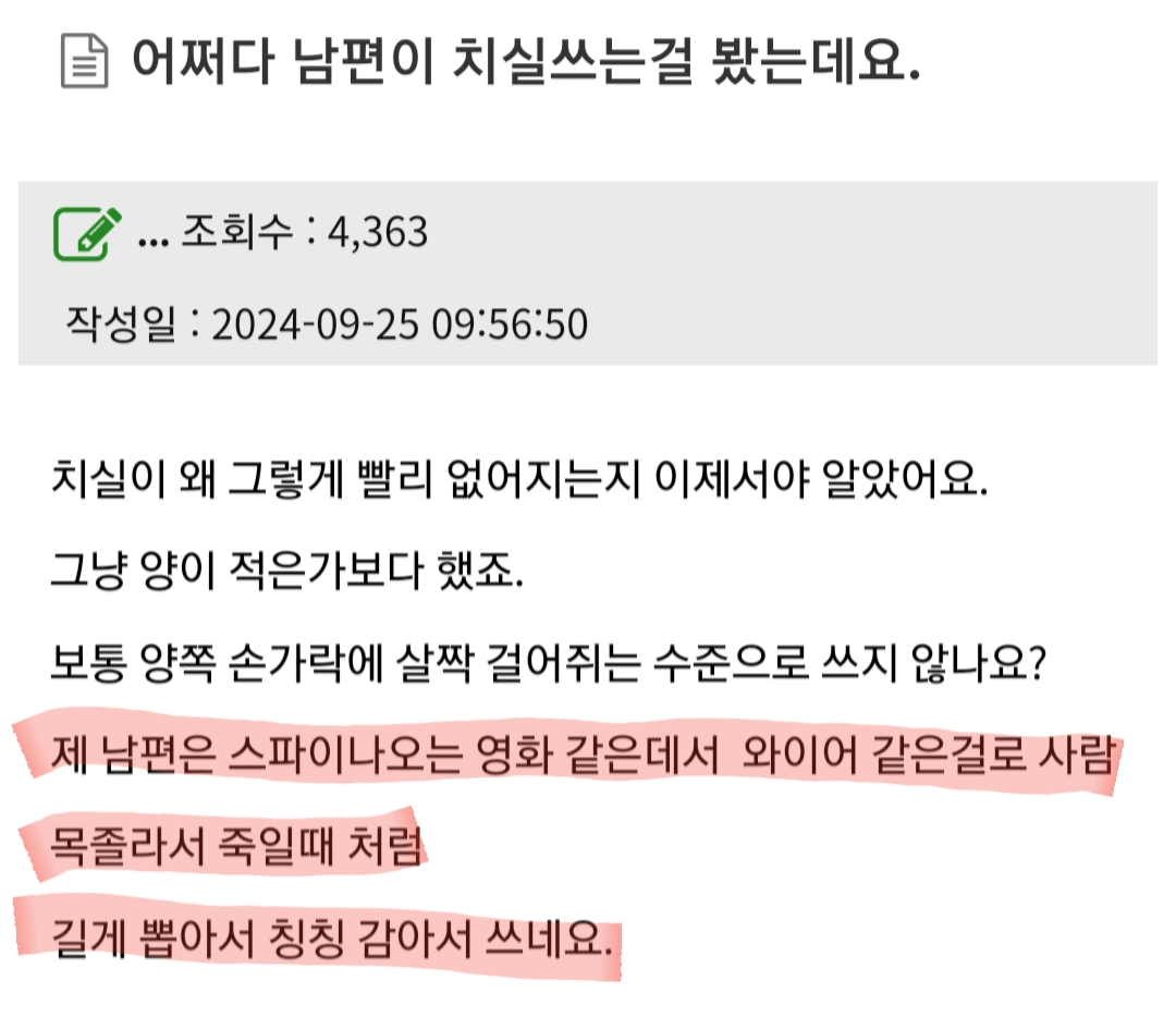 ? Àú°Ô Ä¡½Ç Á¤¼® »ç¿ë¹ý ¾Æ´Ô? Ä¡°ú¿¡¼ Àú·¸°Ô ¹è¿ü´Âµ¥ ¿¹¸¦ µé¸é ±æ°Ô »Ì¾Æ¼ ¿ÞÂÊ ¼Õ °ËÁö¿¡ °ÅÀÇ ´Ù °¨°í ¿À¸¥ÂÊ °ËÁö¿¡´Â ¾ÈÇ®¸± Á¤µµ¸¸ °¨ÀºµÚ ÇÑ Ä¡°£ ´ÛÀ»¶§¸¶´Ù ¿ÞÂÊ °ËÁö¿¡ ÀÖ´Â Ä¡½ÇÀ» Ç®°í ¿À¸¥ÂÊ °ËÁö·Î ¿À¿°µÈ Ä¡½ÇºÎºÐÀ» °¨À¸¸é¼ ±ú²ýÇÑ Ä¡½Ç·Î Ä¡°£À» û¼ÒÇϴ°ÅÀÓ