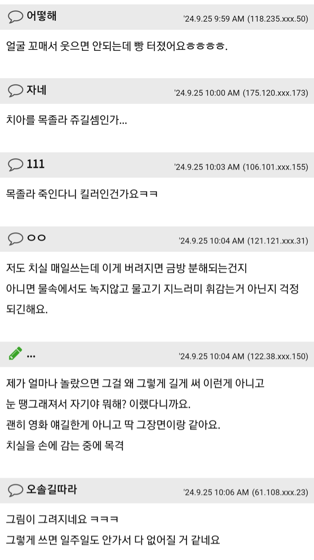 ¾ç¼Õ°¡¶ô¿¡ °É¾î Ä¡½ÇÁúÀ» Çϴµ¥, ¹®Á¦´Â Ä¡½Ç¿¡ ħÀÌ ¹¯À¸¸é °¨¾ÆÁå ºÎºÐÀÌ ¹Ì²ô·¯Á®¼ Ç®¸². ±×·¡¼ ¿©À¯ ÀÖ°Ô ±æ°Ô °¨¾ÆÁã´Â Æí. °Ô´Ù°¡ ¿äÁò ¿À¶öºñ Ä¡½Ç... Àß ²÷¾îÁü. ²÷¾îÁú ¶§¸¶´Ù ºýħ