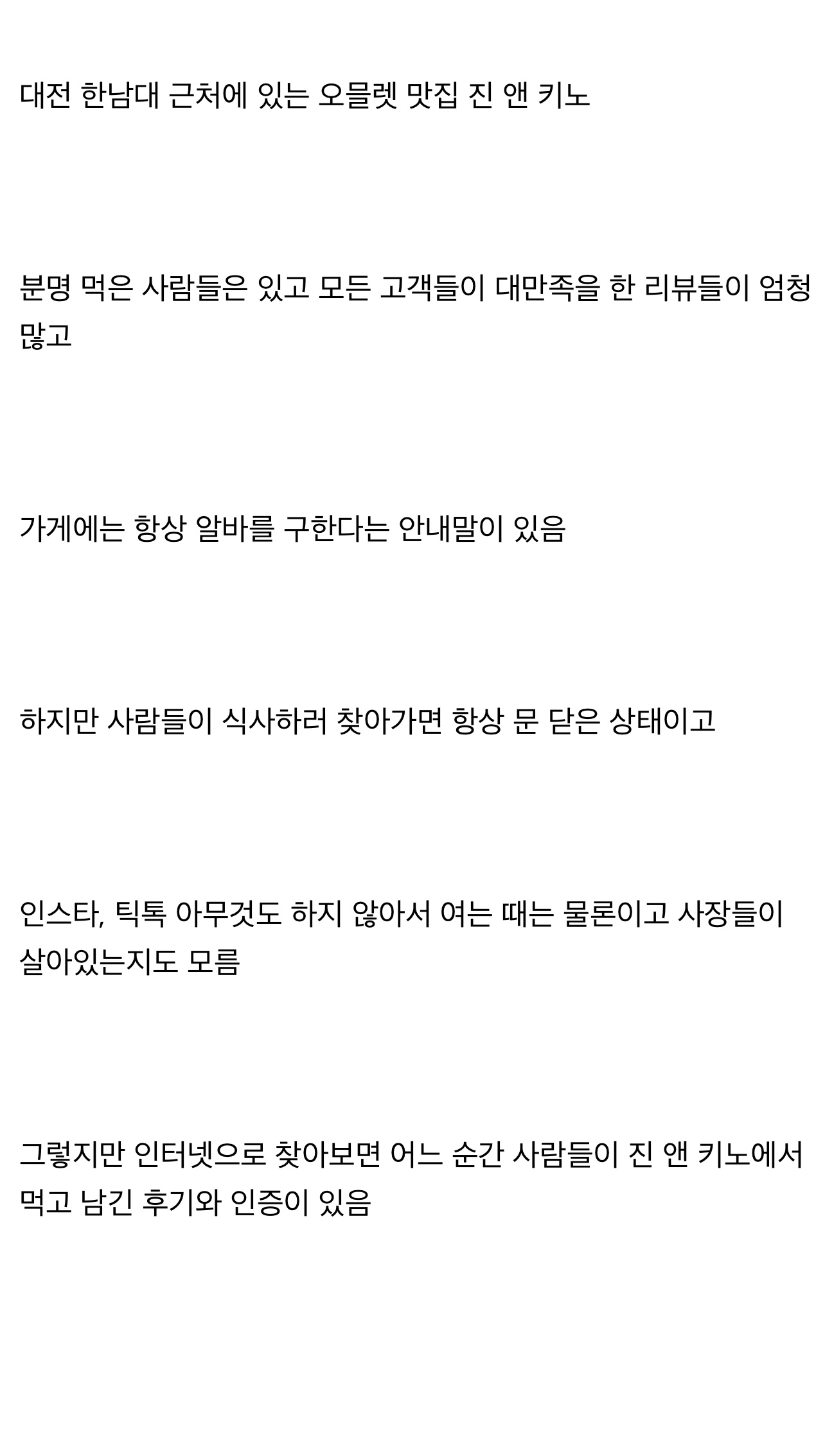 ±Ùµ¥ ¾Ë¹Ù ¸éÁ¢¸¸ º¸°í »ÌÁú ¾Ê¾Æ¿ä »çÀå´Ô ´Ð³×ÀÓÀÌ ÁøÀÌ°í ¸éÁ¢º¸½Å ¸Å´ÏÀú´ÔÀÌ Å°³ë¿©¼ Áø¾ØÅ°³ë¶ó°í ¾ê±âÇØÁֽôõ¶ó±¸¿ä Áø ´ÔÀÌ À¯·´¿¡¼ ¿ä¸®¹è¿ì°í Ű³ë´ÔÀÌ Áø´ÔÇÑÅ× ¹è¿ü´Ù°í ÇÏ½Ã°í µÎ¹øÂ° ¸éÁ¢ ¶§ ¼¿ï¿¡ ÀÖ´Â ½Ä´ç À̸§ ¾Ë·ÁÁÖ½Ç ¼ö ÀÖ³Ä°í ¿©ÂåºÃ´Âµ¥ ¾Ë·ÁÁÙ¼ö ¾ø´Ù°í Çϼ̾î¿ä. Áø¾ØÅ°³ë¸¦ ¿î¿µÀ» ÁßÁöÇÏ°í ¼¿ï¿¡¼ ÇÏ´Â°Ô ´ëÀü ¿ø·¡ ¼Õ´Ôµé¿¡°Ô ¹Ì¾ÈÇϽôٳª.. ¹¹ ±×·± ÀÌÀ¯·Î¿ä °¡²û ºÒÀÌ ÄÑÁ®ÀÖ¾î¼ ÇѹøÀº °¡ºÃ´Âµ¥ ¿µ¾÷À» ¾ÈÇϽŴٰí ÇϽó׿ä. ¸éÁ¢À» °ÅÀÇ Çѽ𣠰¡·® ÀÌ·±Àú·± ¾ê±â¸¦ µÇ°Ô ¸¹ÀÌÇߴµ¥ Áø¾ØÅ°³ë ¿µ¾÷À» ÇÏ°í ½Í¾î¼ Á÷¿ø°ú ¾Ë¹Ù¸¦ ±¸ÇÏ·Á°ï ÇØ¼ 21,22³âµµ¿£ Á¾Á¾ ¾Ë¹Ù¸ó¿¡ ±¸ÀÎÀ» ÇÏ´øµ¥, ±¸Àο¡ ¾î·Á¿òÀÌ ÀÖ¾î¼ ´ëÀü ¿î¿µÀ» ¸øÇÏ°í °è½Å´Ù°í Çϼ̾î¿ä..¤»¤» Àúµµ Çѹø ¸Ô¾îº¸°í ½Í±äÇϳ׿ä