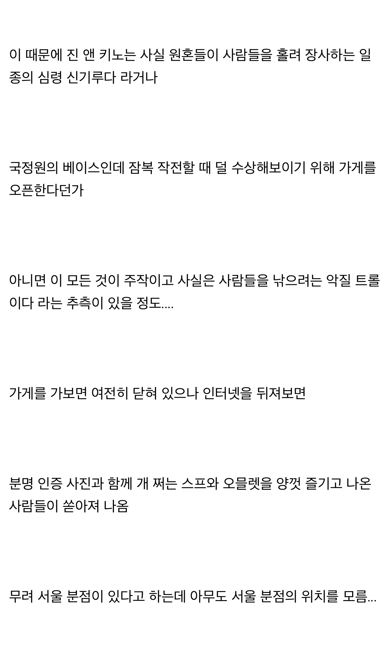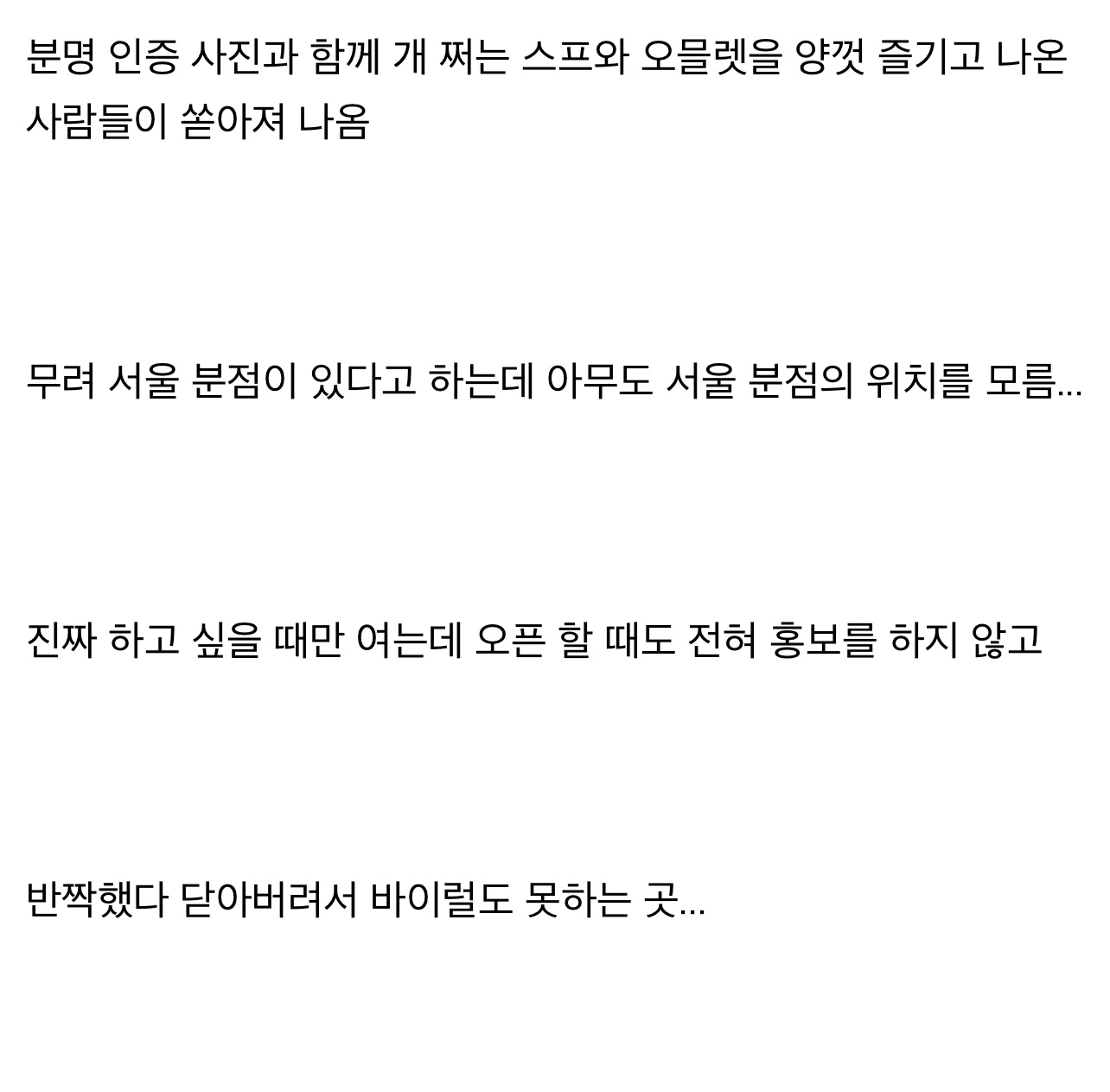 ÆÑƮüũÇÏÀÚ¸é °¡°Ô ÀÌÁ¦ ¿î¿µ¾ÈÇÕ´Ï´Ù »çÀå´Ô µÎºÐÀ̴̼µ¥ ÇѺÐÀÌ ¼¿ï¼ Àå»ç ÁßÀÌ½Ã°í ´Ù¸¥ºÐÀº ÀÚÀ¯·Î¿î ¿µÈ¥ÀÌ¶ó °¡²û û¼Ò¸¸ ÇÏ·¯ °¡°Ô µé¸£½Ê´Ï´Ù