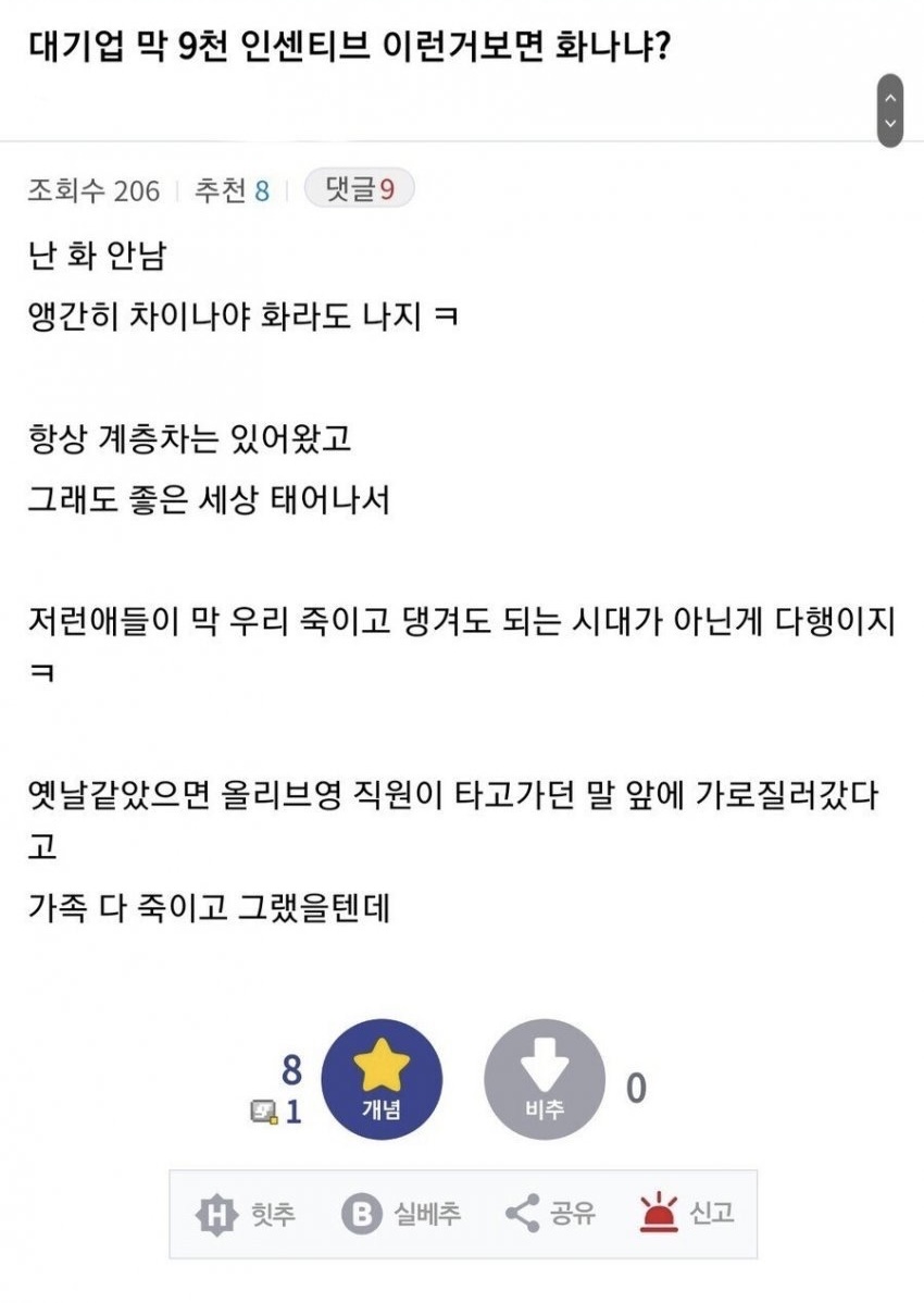 »ç¾÷ÂÊ ¾ÖµéÀÌ ¼º°ú±Ý ÅÍÁö°Ô ¹Þ´Â°Ç ÀßÇßÀ¸¸é ¹Þ¾Æ¾ßÁö. Áö¿øºÎ¼ ¾Öµéµµ ÂɸŠì°ÜÁÖ¸é ÁÁÀº°Å°í... ±Ùµ¥ ³ªµµ Áö¿øºÎ¼Àε¥, Áö¿øºÎ¼¶û »ç¾÷ºÎ¼ Àμ¾ ¶È°°ÀÌ ÁÖ¸é °ï¶õÇÔ. ¿Ö³Ä¸é Áö¿øºÎ¼ÀÎ ³ª´Â ¼º°ú ¾Ð¹ÚÀÌ Àû´çÇÑ ¼öÁØÀÌ°Åµç ¤»¤»¤»¤» ±Ùµ¥ ¾ó¶óµéÀº ³ªÀÇ 100°ú ³²ÀÇ 100ÀÌ ¶È°°ÀÌ º¸»ó¹Þ¾Æ¾ß ÇÑ´Ù°í »ý°¢ÇÏ´Â ¾ÖµéÀÌ ÀÖÀ½.