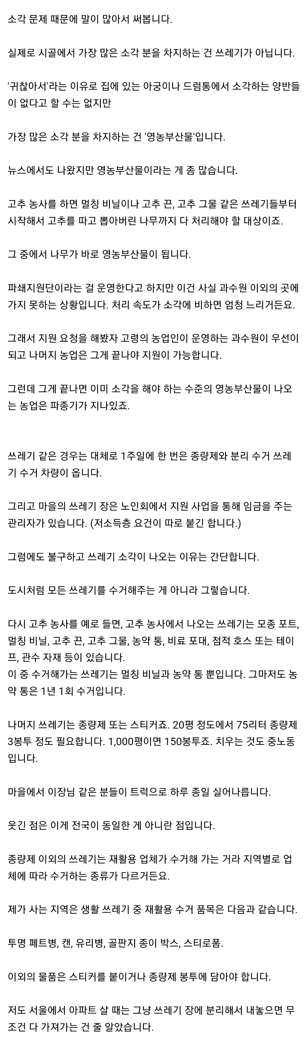 ºñÃß°¢¿ÀÇÏ°í ¾ê±âÇϴ°ǵ¥. ³ëÀε鸸 »ç´Â ½Ã°ñ¿¡¼ ¾²·¹±â¸¦ ¸é»ç¹«¼Ò¿Í¼ Á¾·®Á¦·Î ¹ö¸®¶ó´Â °Å ºÎÅÍ Çö½Ç¼º ¾øÀ½. ÀÌ°Ô °³¼±ÀÌ µÇ¾î¾ß ¼Ò°¢ ÇàÀ§°¡ »ç¶óÁöÁö. »ç½Ç»ó ±¹°¡¿¡¼ ¾²·¹±â ¼Ò°¢ ½¬½¬Çϰí ÀÖÀ½. °³ÀÎÀ» ¿åÇÒ°Ô ¾Æ´Ï¶ó º¹Áö¶ó°í »ý°¢ÇÏ°í ½Ã°ñ ±¸¼®±¸¼®±îÁö ¾²·¹±âÂ÷ µ¹·Á¾ß ÀÌ°Ô ÇØ°áµÉµí.