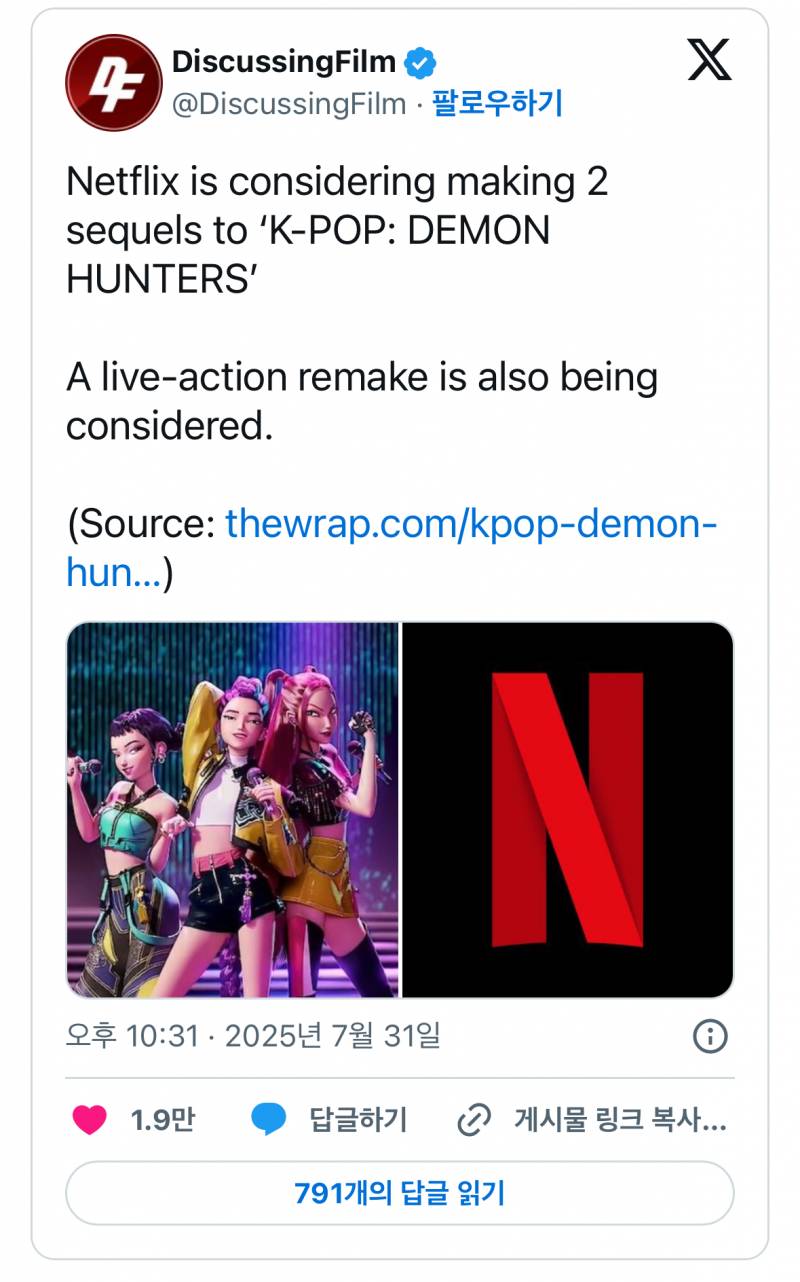 https://www.thewrap.com/kpop-demon-hunters-sequels-franchise-plans-netflix/ ½Ç»çÈ­´Â ³íÀÇÇÑÀû ¾ø´Ù°í ³ÝÇü­ ¿ÀÇÇ¼È ³½°Å °°À½