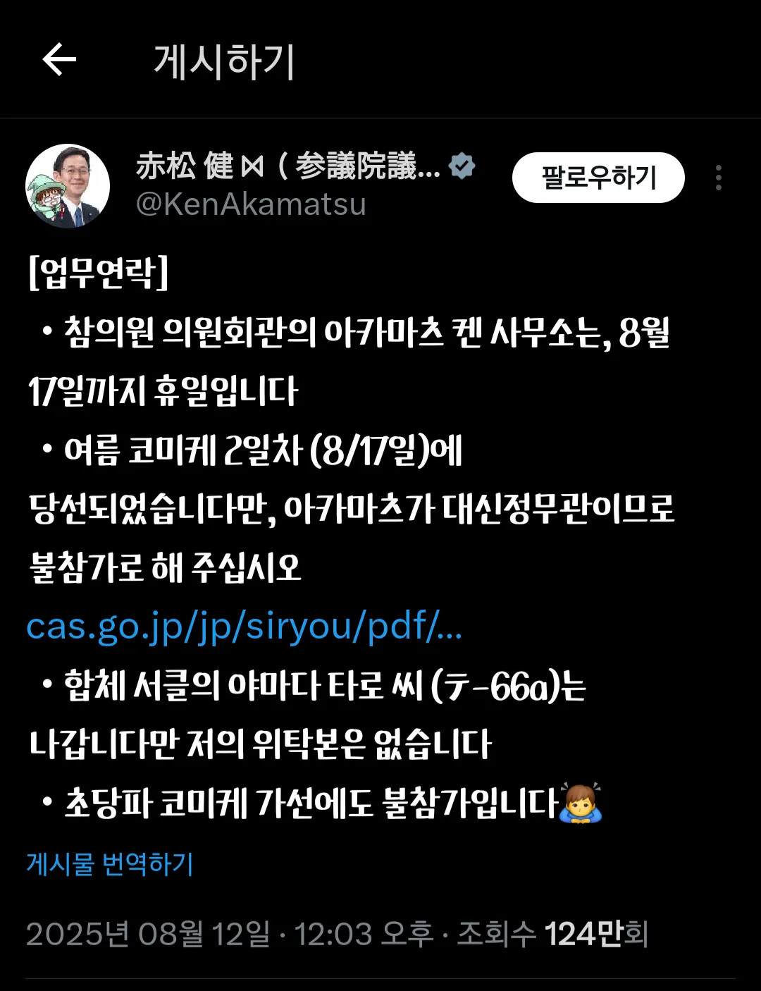 [ºÎ¿¬¼³¸í] ³î¶ø°Ôµµ ÀÛ°¡ÀÎ ¾ÆÄ«¸¶Æ® ÄËÀº 2021³â ÀϺ» ÂüÀÇ¿ø ÀÇ¿ø ¼±°Å¿¡ ºñ·Ê´ëÇ¥·Î Ã⸶ ´ç¼±ÇÏ¿© ÂüÀÇ¿øÀ¸·Î Á¤°è Ȱµ¿À» ½ÃÀÛÇß´Ù. 2014³âºÎÅÍ ÀϺ»¸¸È°¡Çùȸ ÀÌ»ç·Î Ȱµ¿ÇÏ¸ç ¸¸È°¡¿Í âÀÛÀÚµéÀ» À§ÇÑ ¸ñ¼Ò¸®¸¦ ³»´Â µî »çȸÀû Ȱµ¿À» Ȱ¹ßÇÏ°Ô Æì´Ù°¡ ¾Æ¿¹ Á¤°è·Î ÀÔ¹®ÇÑ °Í. ÀÌÈÄ ¸¸È, ¾Ö´Ï¸ÞÀÌ¼Ç µî ¹®È ºÎ¹®À» °üÇÒÇÏ´Â ¹®ºÎ°úÇмºÀÇ ´ë½Å Á¤¹«°ü °â µ¿ÀϺ»´ëÁöÁø ÇÇÇØ ºÎÈïÀ» ¸ñÀûÀ¸·Î ÇÏ´Â ºÎÈïûÀÇ ´ë½Å Á¤¹«°üÀÌ µÇ¾ú´Ù.
