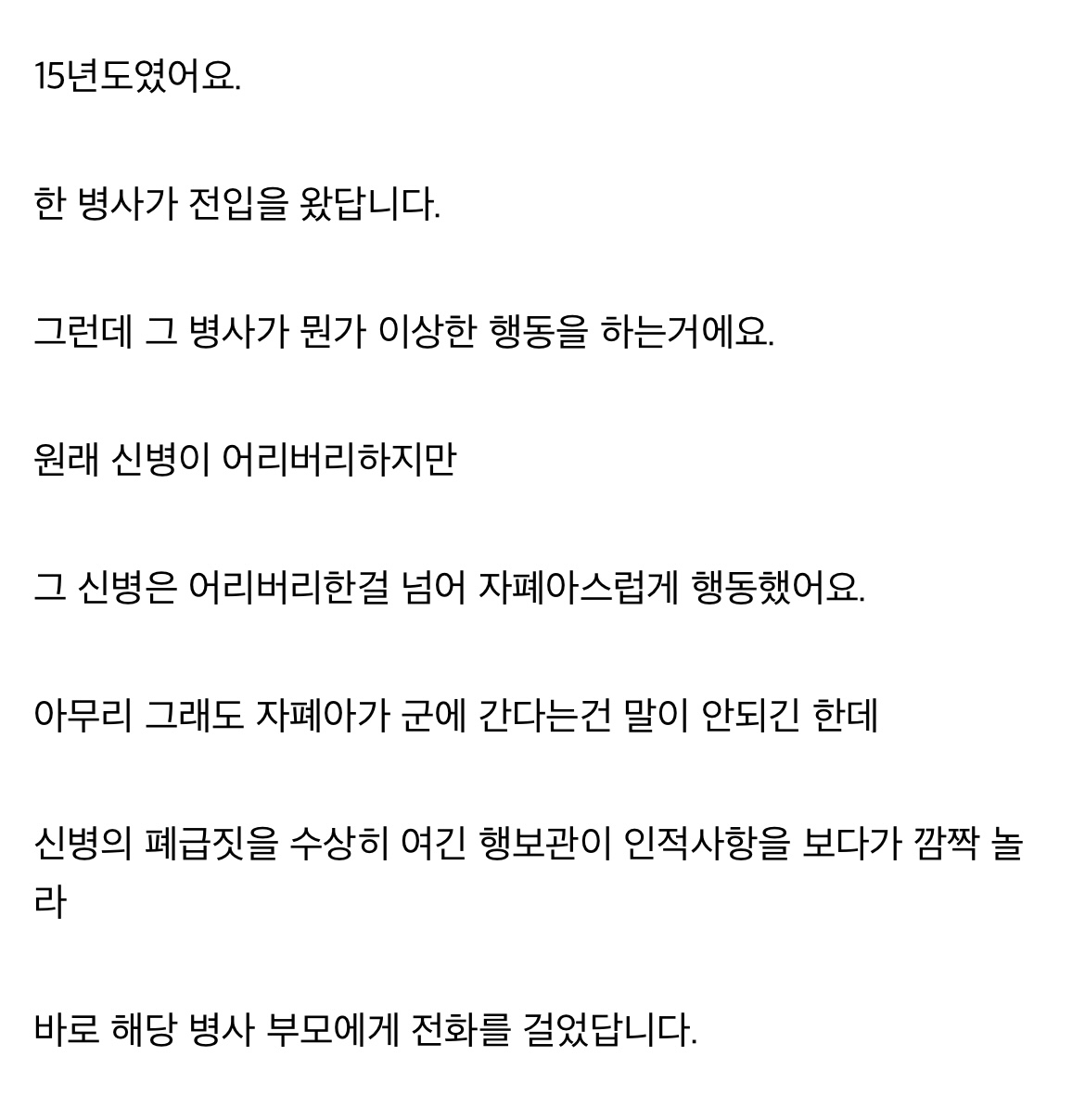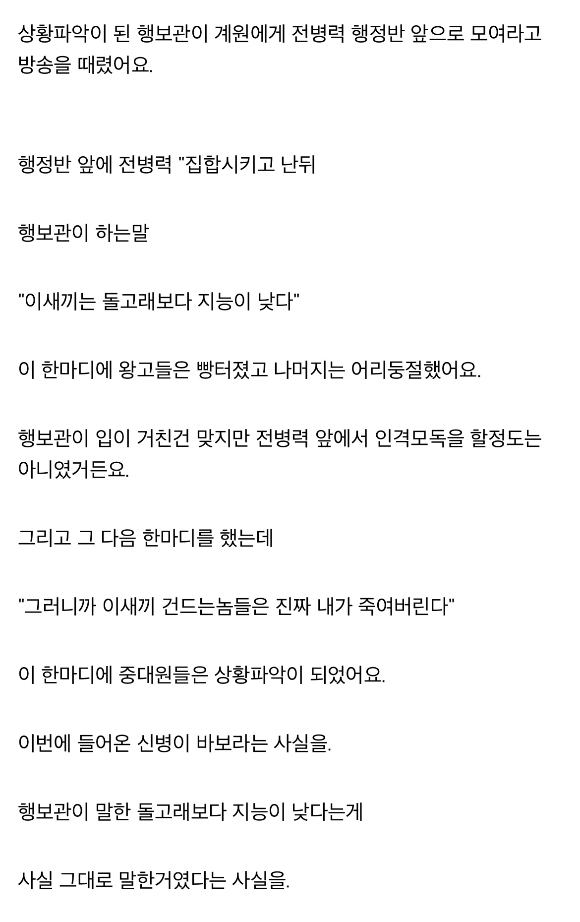 ´Ùµé Çѹø¾¿ ±×°Íµµ ±º´ë¿¡¼ ÀÖ³×, ³ªµµ ÀÖ¾ú´Âµ¥... ¿ì¸® ÈÆ·Ã¼Ò ¼Ò´ë¿¡¼ ¿ì¸®µé º¸´Ù ÇÑÂü Çü´ÔÀε¥ ¹º°¡... ½êÇߴµ¥ ¾Æ´Ï³ª ´Ù¸¦±î ¾î¶² ÇൿÀ» Àß ¸øÇÏ½É ¾Æ ±×·¡¼ ¿ì¸®´Â Á½´ñ´Ù ¸¦ ¿ÜÄ¡¸ç ¿ì¸® »ýȰ°üÀÇ ¸ðµç ¼Ò´ë´Â Á¤¸» ±× ÇüÀ» ¼Æ÷Æ® ÇßÀ½ ƯÈ÷ ³» ¿·ÀÚ¸®¿´°Åµç ´ÙÇàÈ÷ ¿ì¸® »ýȰ°ü ¼Ò´ëÀå ÈÆ·Ãº´, ºÎ¼Ò´ëÀå ÈÆ·Ãº´ÀÌ ³Ê¹« ÁÁÀº Ä£±¸µéÀ̾úÀ½ ºÎ¼Ò´ëÀå ÈÆ·Ãº´ÀÌ ÀÀ±Þ±¸Á¶»ç ±× ¿·¿¡´Â ³ª ±×¸®°í ±×Çü ±×¸®°í ±× ¿·¿¡´Â °³±×¸Ç Áö¸Á»ýÀÌ¾î¼ Á½°°Àº »óȲ¿¡µµ ¾î¶»°Ôµç ºÐÀ§±â ÁÁ°Ô ÁÁ°Ô ÇÏ·Á°í ³ë·ÂÇßÀ½ ´öºÐ¿¡ ³ªÇÏ°í °³±×¸Ç Áö¸Á»ý Ä£±¸´Â º»ÀÎ °ü¹°´ë¿Í ±×Çü´Ô °ü¹°´ë ì±â°í, ¸Ç³¯ ½Å¹ß ½Å±â°í, ÃÑ Ã¬±â°í, ÈÆ·Ã°¡¸é ±× Çü´Ô ¿·¿¡¼ ¼Æ÷Æ®ÇÏ´Â°Ô ¿ì¸®µé ÀÏ À̾úÀ½ Á¤¸» Áö±Ý »ý°¢ÇØ º¸¸é ¼Ò´ë ÈÆ·Ãº´ ¸ðµÎ ÂøÇÏ°í ¹è·Á°¡ ¸¹¾Ò³×