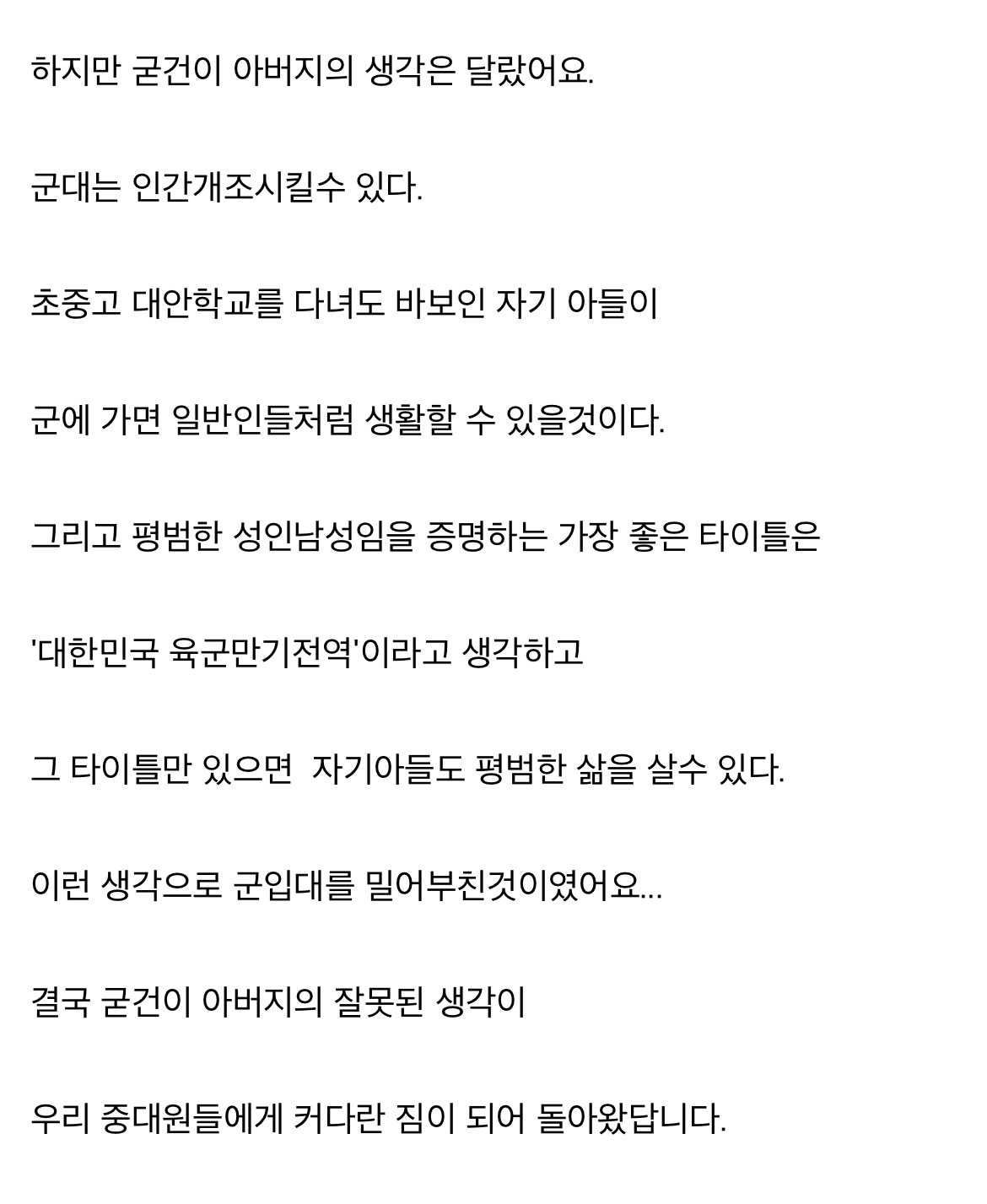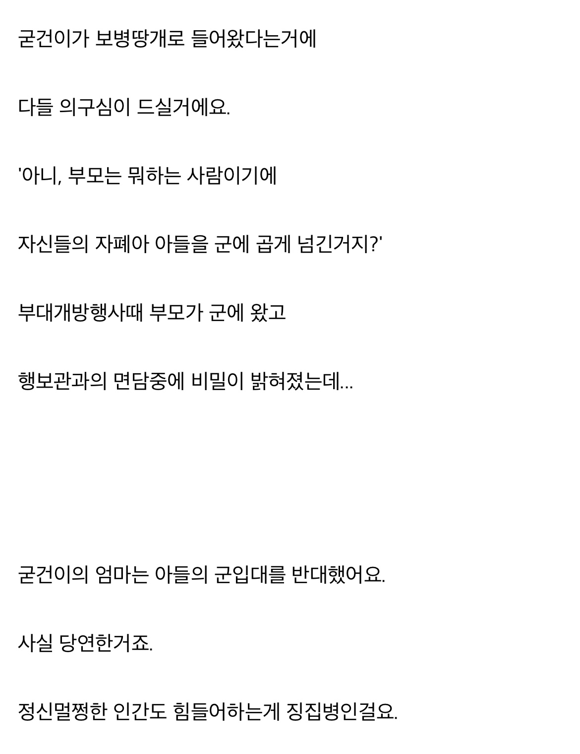 ±ºÀÎ µ¿·áµé¿¡°Ô ´ç¿¬È÷ ¹ÎÆóÁö. ±×·±µ¥ ¾ÆµéÀÌ ³ª¾ÆÁú °Å¶ó´Â Èñ¸ÁÀ» ³õÁö ¾Ê¾Ò´Ù´Â Á¡Àº ³Ê¹« ½½ÇÁ´Ù. ¾Æºü·Î¼ ¾ÆµéÀÌ ¹ÎÆóÀÏ °É ¾Ë°íµµ, ´«¹°À» È긮¸ç ±º´ë¿¡ º¸³»´Â ¼±ÅÃÀ» ÇÒ ¼ö¹Û¿¡ ¾ø´ø °ÍÀº ¾Æ´Ò±î... ±×µé »çÀÌ¿¡ Á¤È®È÷ ¹«½¼ ÀÏÀÌ ÀÖ¾ú´ÂÁö´Â ¾Æ¹«µµ ¸ð¸£°í ¿ì¸®°¡ Æò°¡ÇÒ Çʿ䵵 ¾ø´Ù.
