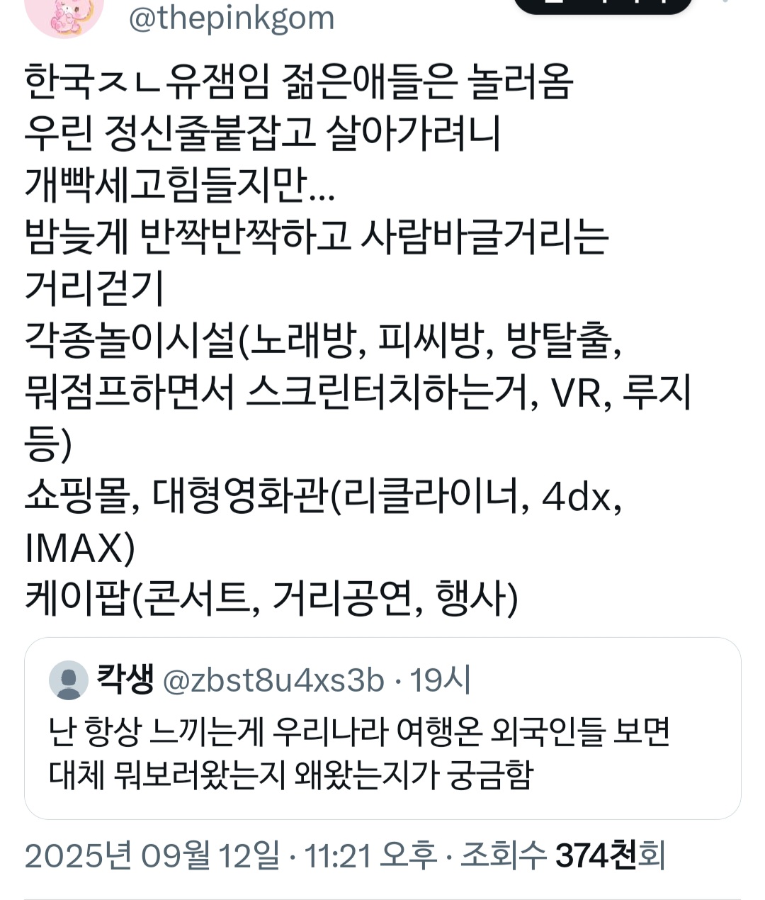 ³ªµµ ÇØ¿Ü¿¡¼­ Çѱ¹À» ¿©Çà°¡´Â ÀÔÀåÀÌ°í ¿Ü±¹ÀΠ챏µé Çѱ¹ °ü±¤ °¡À̵嵵 ¸¹ÀÌ ÇØÁØ °æÇèÀ» ¹ÙÅÁÀ¸·Î Çѱ¹Àº ½Äµµ¶ô¿©ÇàÀÌ 50 ¼îÇÎ 30 º¼°Å 20ÀÓ. ¸Ô°Å¸®°¡ Á¤¸» Çϵåij¸®ÇÔ. º¼°Å¸®´Â ¼­¿ï¿¡´Â ±Ã±ÈÀÌ °¡Àå ¾ÐµµÀûÀ̰í Á¾Á¾ ½Ã°£ ¿©À¯µÇ¸é ³²»êŸ¿ö Á¤µµ? ÀÌ¹Ì Çѱ¹¿¡ ´ëÇÑ °ü½ÉÀÌ ¸¹¾Ò´ø ´ë»óÀ̶ó¸é º¼ °Å¸®°¡ 50 µÇ´Â °æ¿ìµµ ÀÖÀ½. ¼­¿ï ÇÑÁ¤ ±Ã±È•û¸é ¹¹ ´ë´ÜÈ÷ Çѱ¹¸¸ÀÇ "º¸·¯ °¥ ¸¸ÇÑ"°Ô µüÈ÷ »ý°¢³ª´Â°Ô ¾ø¾î¼­ ¹º°¡¸¦ º¸·¯°¡´Â ¿©ÇàÀ» Ãß±¸ÇÏ´Â »ç¶÷À̶ó¸é "Çѱ¹¿¡ ´ëü ¹» º¸·¯ ¿À´Â°ÅÁö?" ¶ó´Â Àǹ®Á¡ÀÌ »ý±æ ¼öµµ ÀÖ´Ù »ý°¢ÇÔ. [5]