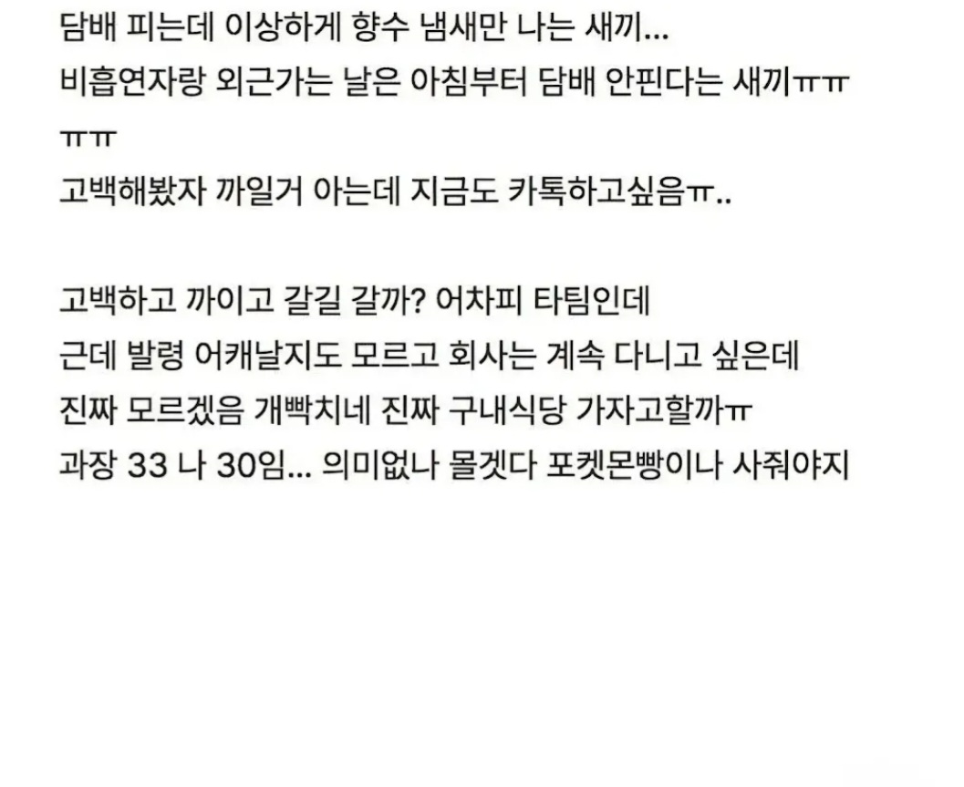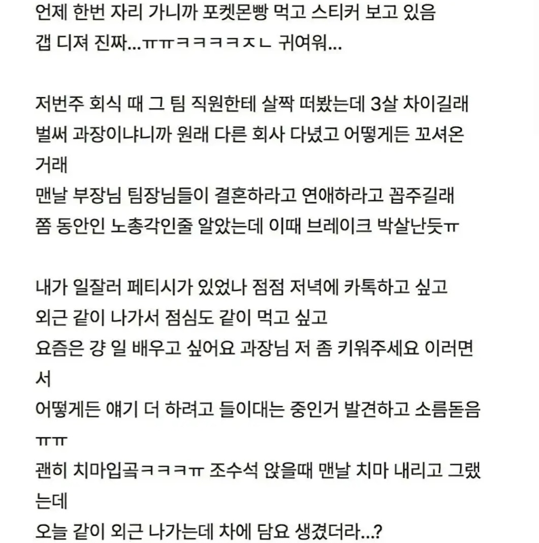 ÀúÁ¤µµ ¼º°ÝÀÌ¸é ´ã¿äµµ ¼± ÁöŰ·Á°í °®´Ù³õÀºµí. ¿©Ä£ÀÌ ÀÌ¹Ì Àְųª ȸ»ç¿¡¼± Àý´ë ¿¬¾Ö ¾ÈÇϰųª