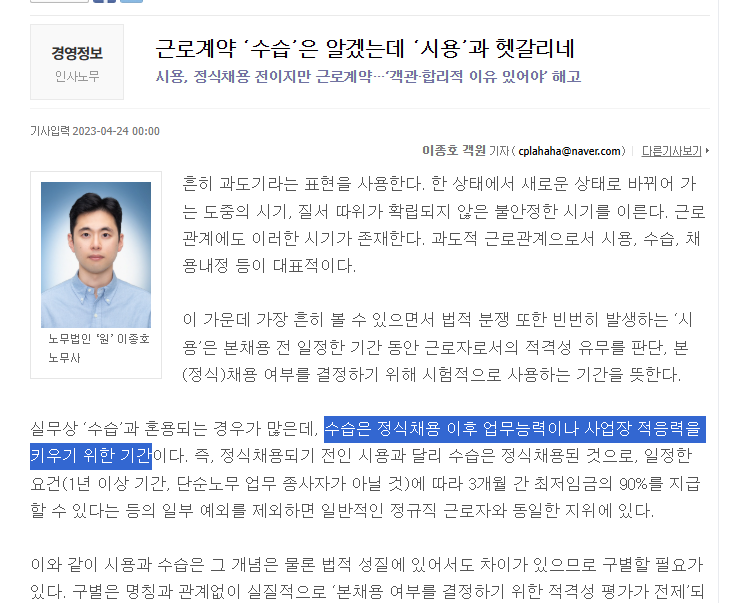¼ö½À±â°£À» Á¤±ÔÁ÷ ä¿ëµÈ ±Ù·ÎÀÚ ±³À°±â°£À̶ó´Â °Í ÀÚü°¡ óÀ½ µé¾îº½. °è¾àÁ÷µµ ¼ö½À±â°£ÀÌ °¡´ÉÇÑ ¹üÀ§¶ó.