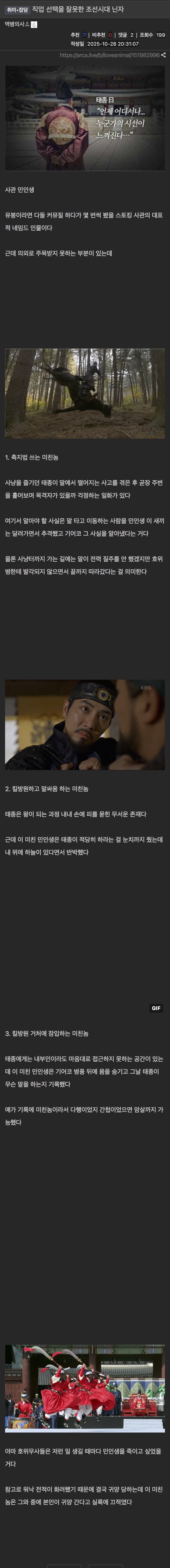 [ºÎ¿¬¼³¸í] ¹ÎÀλý. Á¶¼± ÃʱâÀÇ »ç°ü. Á¶¼±¿ÕÁ¶ ¿ª»ç»ó °¡Àå À¯¸íÇÑ »ç°ü Áß ÇϳªÀÌ´Ù. ÅÂÁ¾ 1³â ÀÓ±ÝÀÌ ¸Å»ç³ÉÀ» ³ª°¬À» ¶§ ¸ô·¡ º¯ÀåÀ» Çϰí ÀÓ±ÝÀÇ »ç³ÉÀ» µû¶ó°¬´Ù. ÅÂÁ¾ÀÌ ³ªÁß¿¡¾ß ¹ÎÀλýÀÌ µû¶ó¿Â °ÍÀ» ¾Ë¾ÆÂ÷·È´Âµ¥ ¹«¾ù ¶§¹®¿¡ »ç³ÉÅͱîÁö µû¶ó¿Ô³Ä ¹¯ÀÚ '¿ª»ç¸¦ ±â·ÏÇÏ´Â »ç°üÀÇ Á÷ºÐÀ» ´ÙÇϱâ À§ÇØ µû¶ó¿Ô´Ù'¶ó°í ½ÇÅäÇß´Ù. ÅÂÁ¾ÀÌ È¸¦ ³»·Á ÇÏÀÚ À̼÷¹øÀÌ »ç°üÀÇ ¿ªÇÒÀº ¸Å¿ì Áß¿äÇÏ´Ï Çѹø ºÁÁÖ¶ó°í ¸¸·ùÇÏ¿© ¹«»çÇÒ ¼ö ÀÖ¾ú´Ù. ¹ÎÀλýÀº ÀÓ±ÝÀÌ ÈÞ½ÄÀ» ÃëÇÏ´Â ÆíÀü¿¡±îÁö µµ½ÂÁöÀÇ ¸¸·ù¿¡µµ ºÒ±¸ÇÏ°í µé¾î¿Â ÀûÀÌ ÀÖ¾ú´Ù. ÅÂÁ¾ÀÌ ¿©±â±îÁö ¿Ö µé¾î¿Ô³Ä°í ¹¯ÀÚ ¹ÎÀλýÀº "ºñ·Ï ÆíÀüÀ̶ó ÇØµµ ´ë½ÅÀÌ ÀÏÀ» ¾Æ·Ú´Â °Í°ú °æ¿¬¿¡¼ °·ÐÇÏ´Â °ÍÀ» ½Å µîÀÌ ¸¸ÀÏ µé¾î¿ÀÁö ¸øÇÑ´Ù¸é ¾î¶»°Ô °®Ãß¾î ±â·ÏÇϰڽÀ´Ï±î?" ¶ó°í ´äÇÏ¿´´Ù. ÅÂÁ¾ÀÌ À̰÷ ÆíÀüÀº ³»°¡ ½¬´Â °÷ÀÌ´Ï µé¾î¿ÀÁö ¾Ê´Â °ÍÀÌ ¸Â´Ù°í ÇÏÀÚ ¹ÎÀλýÀº ¹°·¯³ªÁö ¾Ê°í "½ÅÀÌ ¸¸ÀÏ °ð°Ô ¾²Áö ¾Ê´Â´Ù¸é À§¿¡ ÇÏ´ÃÀÌ ÀÖ½À´Ï´Ù."¶ó°í ´äÇß´Ù.
