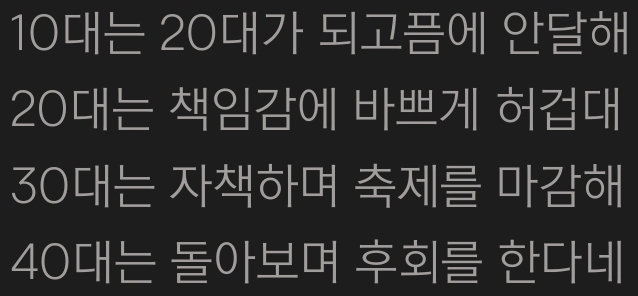 Àú ¸»Àº µµ´ëü ´©°¡ ÆÛ¶ß¸®´Â°ÇÁö Àú ¸» ¶§¹®¿¡ 10´ë ¾ÖµéÀº Âù¶õÇÑ 20´ë¸¦ ÇãÅõ·ç º¸³¾±îºÁ ÃÊÁ¶ÇØÇϰí Àú ¸»¿¡ ¾ô¸Å¿©¼­ 20´ë°¡ µÇ¾î¼­µµ ÁøÁ¤ÇÑ ÇູÀ» ã±â Èûµé¸ç 30´ë¿£ ±×·¸°Ô ÇãºñÇÑ 20´ëÀÇ ÈÄȸ¿¡ ¾ô¸ÅÀ̰ԵÊ