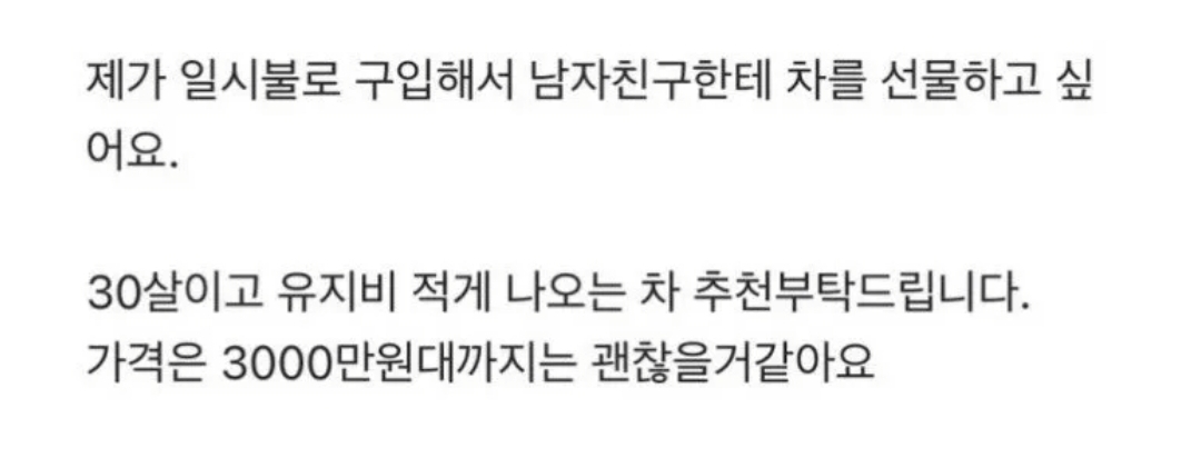 À¯Áöºñ°¡ ½Î´Ù ¾È½Î´Ù ÀÌ·± ¾ê±â°¡ ¾Æ´Ô. º»¹®ÀÇ ³²ÀÚ°¡ ¾ÖÃÊ¿¡ Â÷¿¡ °ü½ÉÀÌ ÀÖ¾úÀ¸¸é Áß°íÂ÷¸¦ »çµç ¾î¼µç Â÷´Â ÀÌ¹Ì ¸¶·ÃÇßÀ» °ÅÀÓ. º»ÀκÎÅͰ¡ Â÷¸¦ ¼ÒÀ¯ÇÏ´Â °Í¿¡ Å« ÀÇÁö°¡ ¾ø´Â °ÅÀÓ. °ü½ÉÀÌ ÀÖ¾úÀ¸¸é ¿©ÀÚÄ£±¸ÇÑÅ× Æò¼Ò¿¡ Â÷Á¾¿¡ °üÇØ ¾ê±âÇß°ÚÁö. ±Ùµ¥ ¹¹? ³²Ä£ÀÌ ¹«½¼ Â÷¸¦ ÁÁ¾ÆÇÏ´ÂÁöµµ ¸ð¸¥´Ù°í? ¾Æ¹«¸®ºÁµµ ÁÖÀÛ³¿»õ°¡ ¸¹ÀÌ ³².