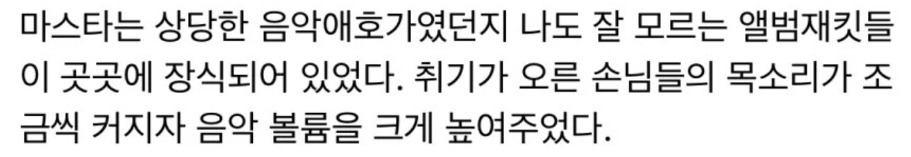 ¸ÅÀåÀÇ À½¾Ç ¼±°îÀÌ ¸Å¿ì ÁÁ³×¿ä(=À½½ÄÁ¡ÀÎ ÁÖÁ¦¿¡ À½¾ÇÀ» ½Å°æ¾²Àϸ¸Å Å©°Ô Ʋ¾î³õ³Ä). °Ô´Ù°¡ ÀÌ ¿ä¸®¿Í ¼úµµ ¾ÆÁÖ Àß ¾î¿ï¸³´Ï´Ù(=À½¾Ç¶§¹®¿¡ Á¤½Å¾ø´Â ¿ÍÁß¿¡µµ À½½ÄÀ̶û ¼ú¸ÀÀÌ °³ÆÇÀ롂 ¾Ë°Ú´Ù). Á¦ Ä£±¸µé¿¡°Ôµµ ÀÌ °¡°Ô¸¦ ¾Ë·ÁÁÖ°í ½Í³×¿ä(=³ª´Â ´Ù½Ã ¿Ã ¸¶À½ÀÌ ¾ø°í ³» ÁöÀε鿡°Ôµµ ±×·¸°Ô ¸»ÇÒ°Å´Ù).