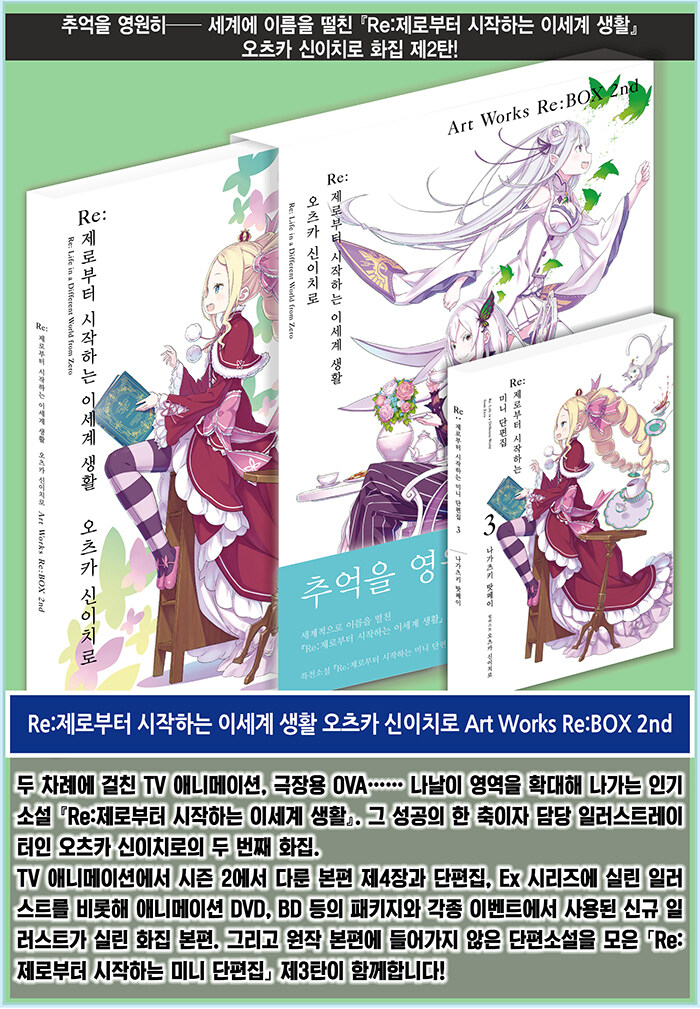 Re:Á¦·ÎºÎÅÍ ½ÃÀÛÇÏ´Â À̼¼°è »ýȰ ¿ÀÃ÷Ä« ½ÅÀÌÄ¡·Î Art Works Re:BOX 2nd Á¤°¡ : 50,000¿ø Á¤º¸ : 192ÂÊ ´ã´ç ÀÏ·¯½ºÆ®·¹ÀÌÅÍÀÎ ¿ÀÃ÷Ä« ½ÅÀÌÄ¡·ÎÀÇ µÎ ¹øÂ° ÈÁý. TV ¾Ö´Ï¸ÞÀ̼ǿ¡¼ ½ÃÁð 2¿¡¼ ´Ù·é º»Æí Á¦4Àå°ú ´ÜÆíÁý, Ex ½Ã¸®Áî¿¡ ½Ç¸° ÀÏ·¯½ºÆ®¸¦ ºñ·ÔÇØ ¾Ö´Ï¸ÞÀÌ¼Ç DVD, BD µîÀÇ ÆÐŰÁö¿Í °¢Á¾ À̺¥Æ®¿¡¼ »ç¿ëµÈ ½Å±Ô ÀÏ·¯½ºÆ®°¡ ½Ç¸° ÈÁý º»Æí. ±×¸®°í ¿øÀÛ º»Æí¿¡ µé¾î°¡Áö ¾ÊÀº ´ÜÆí¼Ò¼³À» ¸ðÀº ¡¸Re:Á¦·ÎºÎÅÍ ½ÃÀÛÇÏ´Â ¹Ì´Ï ´ÜÆíÁý¡¹ Á¦3źÀÌ ÇÔ²²ÇÑ´Ù.