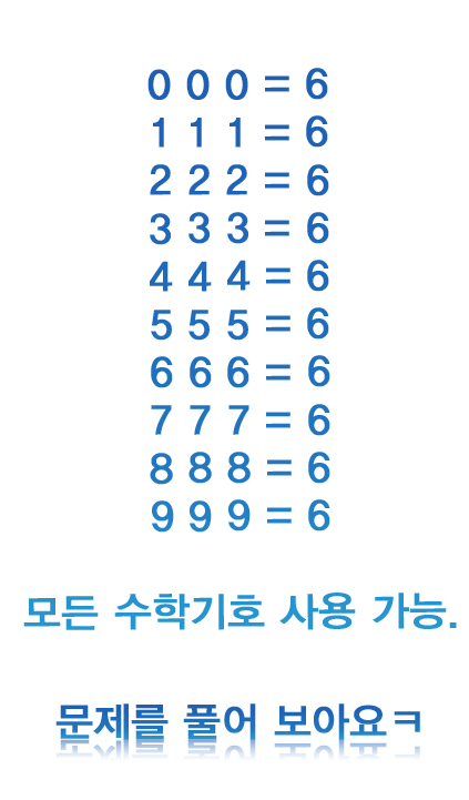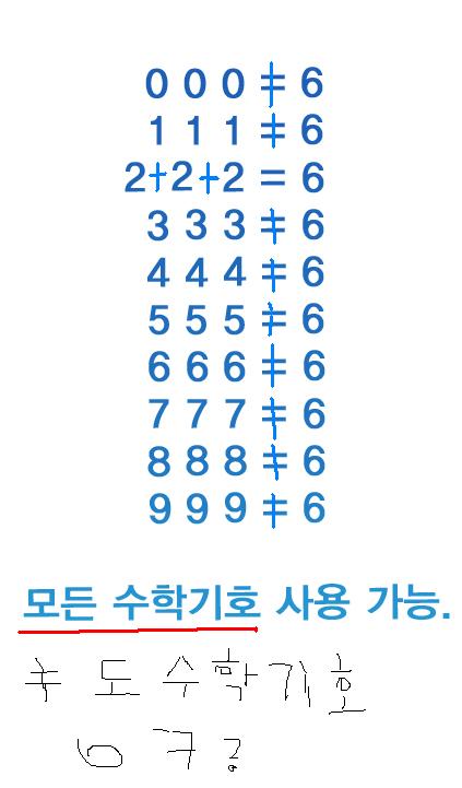 [Sec(0)+Sec(0)+Sec(0)]!=6 (1+1+1)!=6 --- 2+2+2=6 3x3-3=6 ¡î4+¡î4+¡î4=6 5+5/5=6 6+6-6=6 7-7/7=6 3¡î8(¼¼Á¦°ö±Ù)+3¡î8+3¡î8=6 ¡î9x¡î9-¡î9=6 [7]