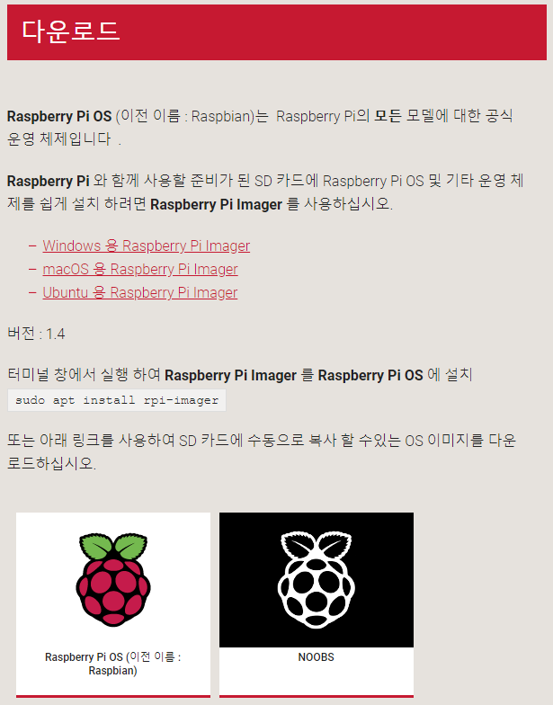 ȨÆäÀÌÁö À§ â¿¡¼­ - Windows ¿ë Raspberry Pi Imager¸¦ Ŭ¸¯ÇÏ¿© ´Ù¿î·Îµå ¹Þ´Â´Ù. Ä£ÀýÇÏ°Ô »¡°£ ±Û¿¡ ÁÙ±îÁö ÃijùÀ¸´Ï Çò°¥¸®Áö ¾Êµµ·Ï ÇÑ´Ù.
