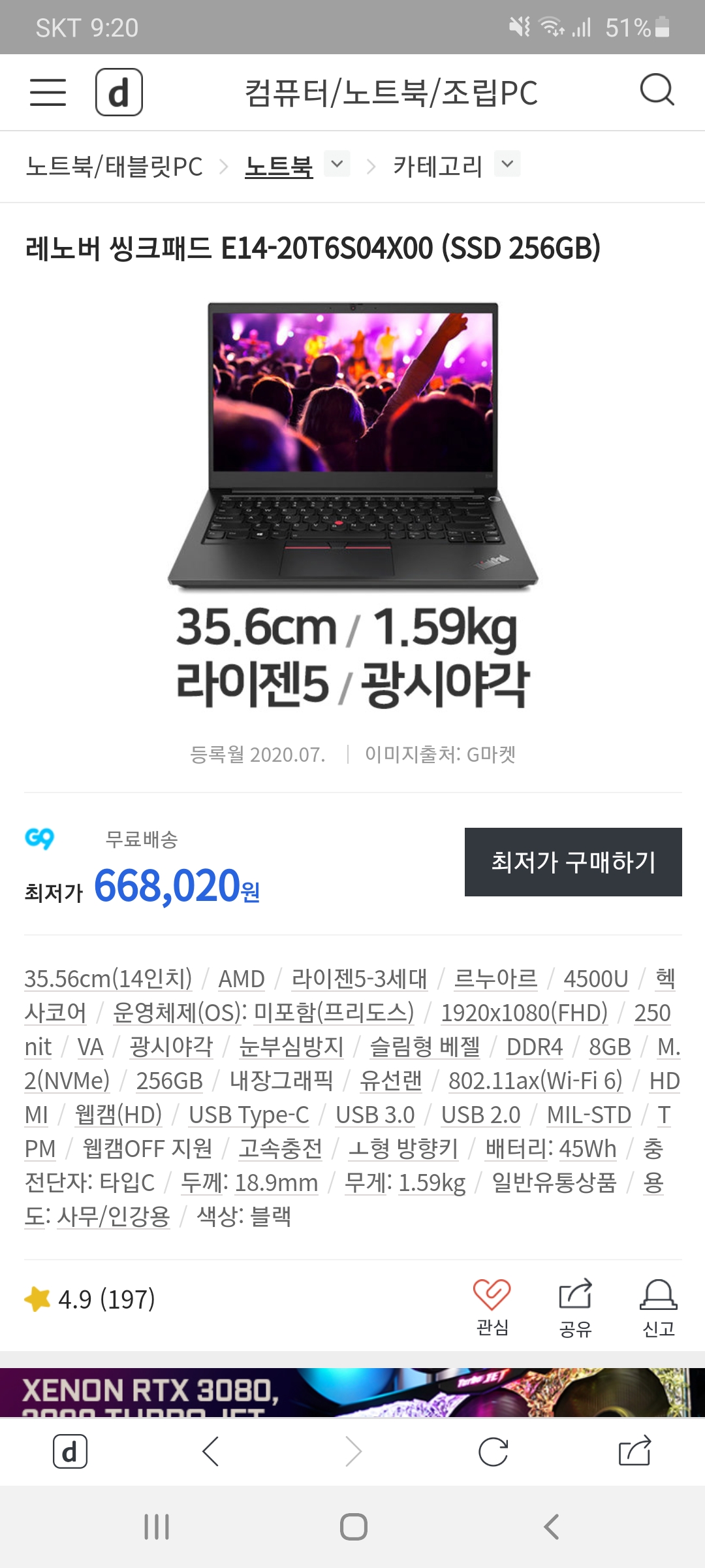 À½ ¹«°Ôµµ 15.6ÀÎÄ¡¶û ºñ½ÁÇѵ¥ ±×³É ¾ÆÀ̾ð J6F ¿ïÆ®¶óºÏ 15.6"/¸£´©¾Æ¸£/4500U/8GB/NV256G/36Wh/1.5kg 599,000¿ø °¡½Ã´Â°Ô ³·Áö ¾ÊÀ»±î¿ä. 14ÀÎÄ¡ ½áº¸´Ï È­¸é ³Ê¹« ÀÛ°Ô ´À²¸Áö´õ¶ó±¸¿ä.