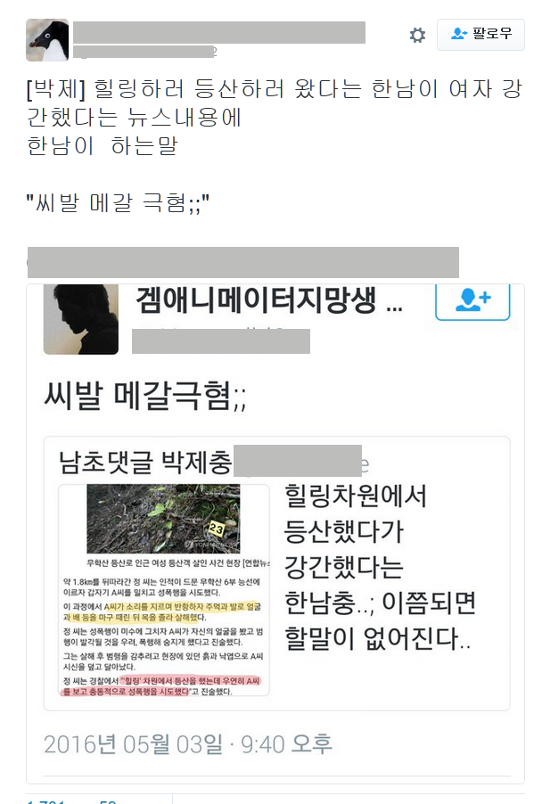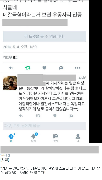 ¾Æ.. ±Û ³¯¶ó°¡¼ ¼¼¹øÂ° ´Ù½Ã¾´´Ù.. ¿ì¼±, Á¦¸ñ°ú ³»¿ëÀÌ »ì¦ ´Ù¸£´Ù´Â°É ¾Ë·ÁÁÖ°í½Í¾î. ´Ù¸§ÀÌ ¾Æ´Ï¶ó ¾îÁ¦ºÎÅÍ Æ®À§ÅÍ¿¡¼ ¸Þ°¥µéÇÑÅ× Áú¸®°Ô ½Ã´Þ¸².. ³»°¡ ¾îÁ¦ Æ®À§Å͸¦ ÇÏ´Ù°¡ ´Ù¸¥»ç¶÷ÀÌ ¿î¿ëÇÑ ±â»ç¸¦ º¸°ÔµÇ¾ú´Âµ¥, ³»¿ëÀÌ ÇÑ ¿©¼ººÐÀÌ µî»êÀ» °¬´Ù°¡ °°£»ìÇØ¸¦ ´çÇß´Ù´Â ³»¿ëÀ̾ß, ³»¿ëÀº Âü ¾ÈŸ±õ°í Ȱ¡³ª´Âµ¥ ±× ±â»ç¸¦ °øÀ¯£¨Àο룩 ÇÑ»ç¶÷ ¸àÆ®¿¡ 'Çѳ²Ãæ' À̶ó´Â ´Ü¾î°¡ ÀÖ´õ¶ó±¸, ´Ð³×ÀÓ°ú ÇÁ»çµµ ½É»óÄ¡¾Ê¾Ò±æ·¡.. ÇÁ·ÎÇÊ¿¡ µé¾î°¡¼ ±Û°ú ÆÈ·Î¿ìµéÀ» ºÃ¾î, »©¹Ú ¸Þ°¥ ³²Çø·¯´õ¶ó°í... ±ÛÀº °ÅÀÇ´Ù ¸Þ°¥,³²Çø¿¡ °üÇÑ °Å´õ¶ó±¸. ±×·¡¼ ³»°¡ ¸ÛûÇϰԵµ ¾ÈŸ±î¿î ±â»ç³»¿ëº¸´Ù °øÀ¯ÇÑ»ç¶÷ÀÌ ¸Þ°¥¸®¾ÈÀ̶ó´Â °Å¿¡ ´õ °¨Á¤ÀÌ Ä¡¿ìÃļ ±× ±ÛÀ» °øÀ¯ÇÏ¸é¼ ¸àÆ®¸¦ "¾¾x ¸Þ°¥±ØÇø;;" ¸àÆ®¸¦ ´Þ°í °øÀ¯¸¦ Çߴµ¥ ±× »ç¶÷ÇÑÅ× ¾Ë¸²ÀÌ °¡¼ ºÃ³ªºÁ, ±×·¡¼ ³»°¡ °øÀ¯ÇÑ ±ÛÀÌ Ä¸Ãİ¡µÇ¾î ¹ÚÁ¦°¡µÇ¼ ¹ÚÁ¦ÃæÇÑÅ× ³Ñ¾î°¡°í °øÀ¯°¡ Áö±Ý ÇÑ 1700 Á¤µµ µÈ »óžß. ÆùÆ®°¡ Ä¿¼ ´õ ÀÚ±ØÀûÀ¸·Î º¸À̳×.. Áö±Ý ¸»ÇßÀ¸¸é ´õ Á¤¸®µÇ°Ô ¸» ÇÒ ¼ö ÀÖ¾úÀ»ÅÙµ¥ ¿ÖÀú·¸°Ô ½èÁö;; ¹°·Ð ³»°¡ ±× ±â»ç¿¡ ¸ÂÁö¾Ê°Ô °æ¼ÖÇÏ°Ô ¸àÆ®¸¦ ½è´ø°Ç ³»°¡ Á¤¸» À߸øÇß°í ¾î¸®¼®¾ú¾î. ³» À߸øÀ» ÀÎÁ¤ÇØ ¹®Á¦´Â ÀÌ ¸»½Ç¼ö¿Í °ü·Ã¾øÀÌ ¾îµð¼ ¼Ò½Äµè°í¿Ô´ÂÁö ¾ÖµéÀÌ ¸ô·Á¿Í¼ Çѳ²ÃæÀ̶ó°í ¹«Á¶°Ç ±î°íº¸´Â ¸Þ¿ÀÈĵé°ú ³²ÇøÀÌ ¾öû ²¿Àδٴ°žß;; ÇÏ±ä ÆÈ·Î¿öºÎÅͰ¡ ¸Þ°¥ÇÏ´Â ÀÚĪ °«Ä¡..¶ó°í ÇÏ´Â ¾ÖµéÀÌ´Ï .. ÆÈ·Î¿öµé ´Ð³×ÀÓº¸¸é ÀÌÇØ°¡ °¥ÅÙµ¥ Â÷¸¶ ¸ø ¿Ã¸®°Ú´Ù.. À§ÇèÇØÁú±îºÁ °Â³×µé ±Û º¸¸é Âü °¡°üÀÌ´õ¶ó, ¿Ü±¹Àº ¿©ÀÚµéÀ» ²Éó·³ º¸È£ÇѴٴµ¥ ¿ì¸®³ª¶ó ³²ÀÚµéÀº ¹¹ ¾àÇÑÁ¸Àç´Â ÆÐµµµÈ´Ù.. ¹¹ ÀÌ·±½ÄÀ̰í ·µç µÇµµ¾ÈÇÑ ¼Ò¸® ¤»¤»¤»¤» °³¼Ò¸® ÁøÂ¥ ¸¹´õ¶ó°í, Áöµé¸¸¿¡ ¼¼°è¿¡¼ »ý°¢Çϴ°ÅÁö, ¹°·Ð ³ª´Â ¿©ÀÚ ³²ÀÚµéÀÌ »ì¾Æ°¡¸é¼ À¯¸®ÇѰÔÀÖ°í ºÒ¸®ÇÑ°Ô ÀÖ´Ù°í »ý°¢ÇÏÁö¸¸, ±×°É ²À ±×·¸°Ô µûÁö°í»ì¾Æ¾ßÇϳª »ý°¢À̵é¾î, ¼·Î Èûµç°Ç ÀÌÇØÇØ¾ßÁö ±»ÀÌ ±×°Å¸¦ ¿Ö ¼¼»óÀÌ À̵û±¸³Ä°í ºñ°üÀûÀ¸·Î »ý°¢Çϴ°Šº¸¸é Âü .. ´ä´äÇÏ´õ¶ó µµ´ëü ¼¼»óÀ» ¾î¶»°Ô »ì¾Æ¿Ô°í ¾î¶²»ç¶÷µéÀ» ¸¸³ª¿Ô±æ·¡ ±×·¸°Ô 됬³ª ½Í´õ¶ó.. Âü ÀÌ»óÇÏ°Ô º¸À̸鼵µ ÇÑÆíÀ¸·Ð ¿¬¹ÎÀÌ ´À²¸ÁúÁ¤µµ, ±×·¡¼ ¸Þ°¥µéÇÏ°í Æ¼°ÝŰÝÇÏ´Ù°¡ ´Þ¸° ´ñ±Û ¸î°³ ¿Ã·Á, ÈνŸ¹Àºµ¥ ¾Ë¸²À̶û ŸÀÓ¶óÀÎ µÚÁ®µµ ÁöµéÀÌ ´Ù Áö¿ü´ÂÁö ±â·ÏÀÌ ¸¹ÀÌ ¾ø³×... ;; ¿©Æ° ³²¾ÆÀÖ´Â°Ç ´ëÇ¥ÀûÀ¸·Î ÀÌÁ¤µµ¹Û¿¡ ¾ø´Â°Í°°¾Æ , À̰ͺ¸´Ù ÈξÀ¸¹¾Ò´Âµ¥;; ´Ù º»ÀÎÀÌ Áö¿ü°Å³ª Â÷´ÜÇß³ªºÁ ±×¸®°í Á¦ÀÏ À§ÇèÇß´ø°Ç ³» Àå·¡Èñ¸ÁÀÌ Àִµ¥ ÀϺ»¿¡ »ç´Â »ç¶÷ÀÌ ³» Æ®À§ÅÍ ÁÖ¼Ò¸¦ ¾ð±ÞÇÏ¸é¼ ¾î¶² ¾÷°èµç ³» ÇÁ·ÎÇÊ¿¡ ÀÖ´Â ³» ȨÆäÀÌÁö¿¡ µé¾î°¡¼ Æ÷Æ®Æú¸®¿À¸¦ º¸°í Àý´ë ÀÌ»ç¶÷ ä¿ëÀ» ½ÃŰÁö¸»¶ó´Â°Å¾ß. °øÀ¯°¡ 30À̳ª µÇÀÖ´õ¶ó.. ±×·¡¼ ÀÏ´Ü ±ÞÇÏ°Ô ³» ÇÁ·ÎÇÊ¿¡ ÀÖ´Â ÁÖ¼Ò Áö¿ì°í µ¿¿µ»ó À¯Åõºê ¿µ»ó ´Ù ºñ°ø°³·Î µ¹·Á³õÀº »óžß. ¾êµé ¿Ü¿¡µµ ¸î½Ê¸íÀº ³ªÇÑÅ× ²¿Åõ¸®Àâ°í ´Ã¾îÁøµí;;100Áß¿¡ ÇÑ 70Àº ¸Þ°¥,²ÃÆä¹Ì°°´õ¶ó, ¾î¶²¾Ö´Â Çѳ²ÃæÀ¸·Î ½ÃÀÛÇØ¼ ÀÚ±âµéÀº ¿¹Àü¿¡ Â÷º°¹Þ¾Ò´ø°Å Åä´ë·Î °í´ë·Î °±¾ÆÁִ°ͻÓÀε¥ ¾ç¼ºÆòµî 뺴¾ê¾ê¾ê¾ê얚!!! Çѳ²Ãæ±ØÇø 뺴¾ê¾ê¾ê얚 !! °Å¸² ... ¿Ö ÀϺ£¶û ¸Þ°¥À̶û °°ÀºÃë±ÞÇϳĴµ¥ ³» »ý°¢¿£ ÀϺ£³ª ¸Þ°¥À̳ª ¶È°°Àº¾ÖµéÀ̾ß, ÀϺ£¸¦ ½È¾îÇÏ¸é¼ ¿Ö ÀϺ£¿ë¾î´Â ¾²´Â°Å°í ÀÏ¹Ý Æä¹Ì´Ï½ºÆ®´Â ÀÌÇØÇϴµ¥ ¿©¼º¿ì¿ùÁÖÀÇ, ³²¼ººñÇÏÇϴ°Šº¸¸é °Á ¶È°°Àº ¤·¾êµé°°¾Æ. ¸î¸îÀÌ °è¼Ó ½Ãºñ°É°í Á¶·ÕÇϱ淡 ³»°¡ Çê¼Ò¸®Çϴ»ç¶÷µéÇÑÅÙ ¾à°£ À¯¸Ó·¯½ºÇÏ°Ô ´ëÃæ ¹«½ÃÇß¾î. ±×·±µ¥ °©Àڱ⠾ »ç¶÷ÀÌ Ã¤ÆÃÀ» ´Þ¶ó±æ·¡ äÆÃÀ»Çߴµ¥ ³» ±ÛÀ» ¹ÚÁ¦ÇÏ°í ÆÛ¶ß¸®´Â»ç¶÷À̶û ½Î¿ì´Â°Í°°´õ¶ó°í, Á» ±â´Ù¸®´Ù°¡ ´äÀÌ ¿Ô´Âµ¥ ³ªº¸°í Á¶½ÉÇÏ¶ó±æ·¡ ¹» Á¶½ÉÇ϶ó´Ï±î ±×»ç¶÷µéÀÌ ¾ê±âÇÏ´Ù°¡ ¸¶À½¿¡ ¾Èµå´Â »ç¶÷ÀÖÀ¸¸é ½Å»óÀ» ÅÐ¾î¼ °í¼Ò¸¦ ¸ÔÀδٴõ¶ó±¸, ÀÌ¹Ì ³ª°°Àº»ç¶÷ 2¸íÀΰ¡ ½Å»óÀÌ Åи®°í °í¼ÒÇÑ »óŶó°í µé¾ú¾î. £¨±× Áß ÇѸíÀº º»Àξ󱼻çÁø Åи°°Å ³»°¡ È®ÀÎÇß°í£© ¹°·Ð ³ »ç¶÷µéÀÌ ³ªÇÑÅ× ½Ãºñ¸¦ °É¾î¿ÔÀ» ¶§ ¿åÀº ÀÏÀýÇÏÁö¾Ê¾Ò¾î, ±×·¡¼ ¸ð¿åÁË·Î °í¼Ò°¡ ¾ÈµÉ°Í°°Àºµ¥ ³ªº¸°í ½Å»ó°ü¸® ÀßÇ϶ó°í ¸»ÇØÁÖ´õ¶ó Ƽ´Â ¾È