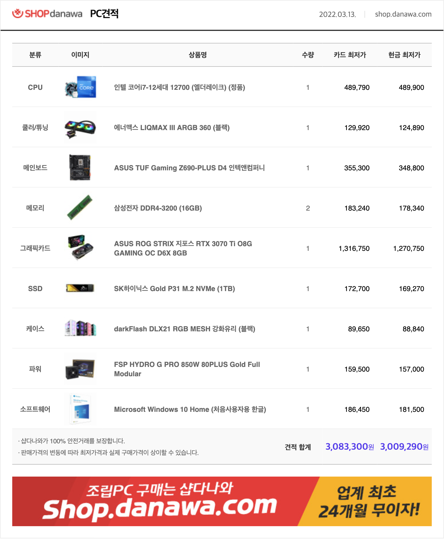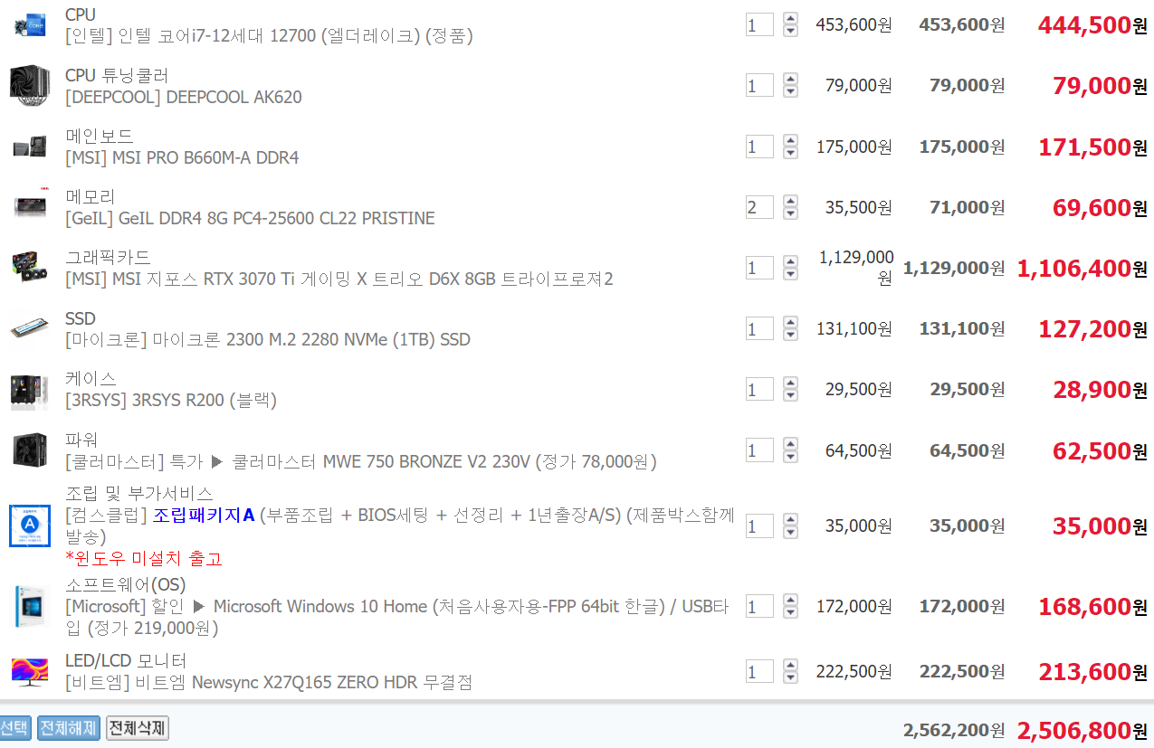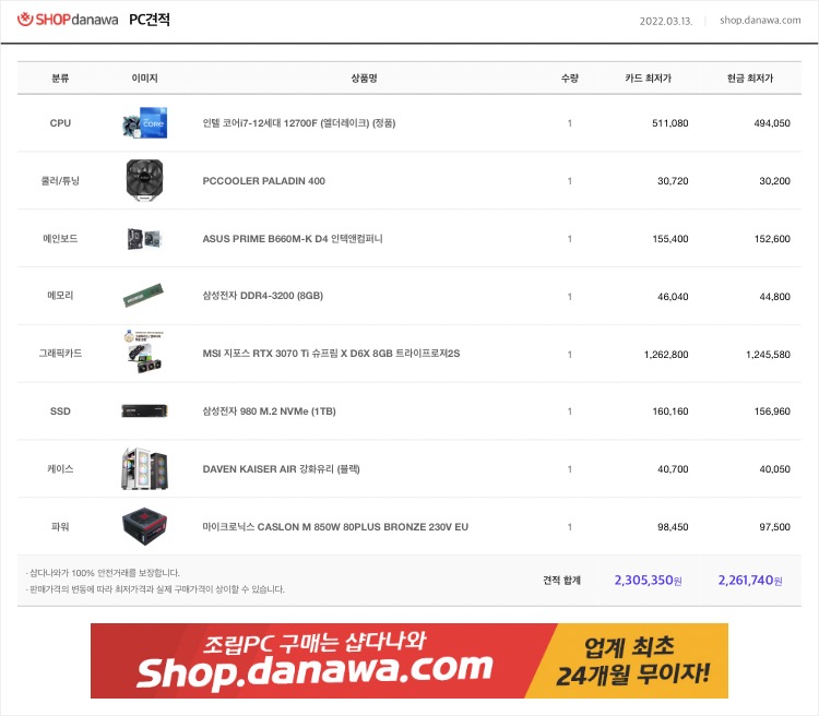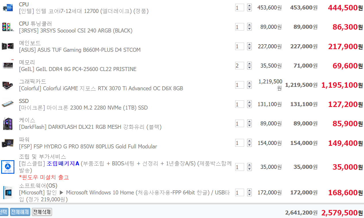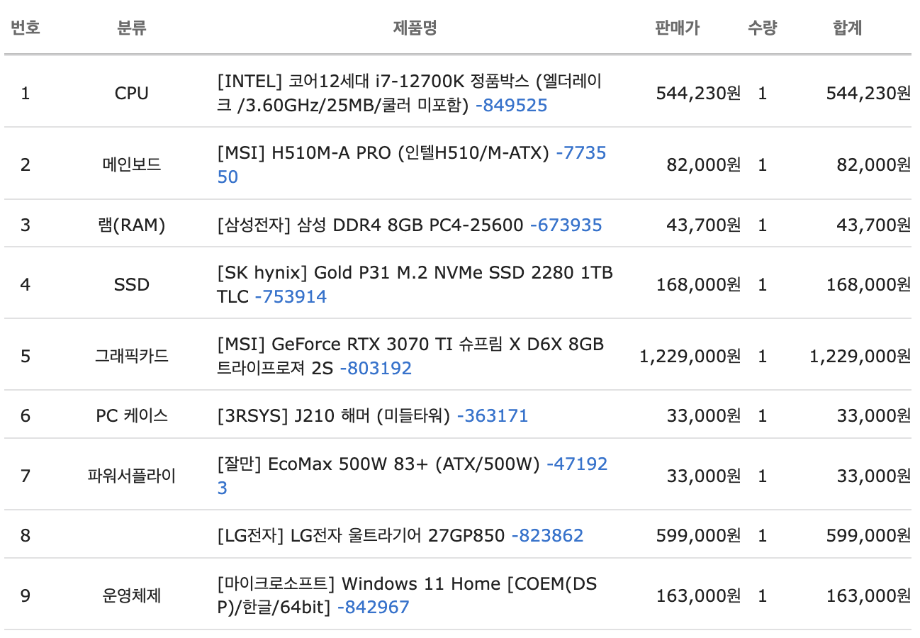 ÀÏ´Ü i7 °æ¿ì K°¡ ¾øÀ¸¸é ½ÃÇÇÀ¯ ¿À¹ö ¹ÌÁö¿øÀε¥ Z690Àº ½ÃÇÇÀ¯ ¿À¹ö Áö¿øµÇ¼ »ç´Â º¸µå¶ó B660À¸·Î ³·Ãçµµ µÇ°í MSI,±â°¡¹ÙÀÌÆ®´Â °°Àº AS´Ï »©°í Ä𷯵µ 2¿·Î ÃæºÐÇØ¼ ¹«»ó 6³â Á¦Ç°À¸·Î º¯°æÇß°í 3200 Á¤¹ß·¥ °æ¿ì »ï¼º·¥À̳ª ´Ù¸¥ Á¦Á¶»ç ·¥À̳ª ¼º´É °Å±â¼ °Å±â¶ó AS ÁÁÀº Áß¼Ò±â¾÷ Á¦Ç° °¡¼Åµµ µÇ°í °ÔÀÓÀº 8gx2·Î ÃæºÐÇÕ´Ï´Ù. nvmeµµ 2300, p31 ¼º´ÉÂ÷ÀÌ ¾ø°í µÑ´Ù µð·¥ ÀÖ´Â Á¦Ç°ÀÌ¶ó °¡¼Åµµ ±¦Âú½À´Ï´Ù. ÆÄ¿öµµ 850wÁß Æò°¡ ±¦ÂúÀº Á¦Ç°À̰í 3070ti °æ¿ì MSI Á¦Ç°ÀÌ ¼º´ÉÀ̳ª ¹ß¿°ü¸® ¼ÒÀ½ Æò°¡°¡ ÁÁ¾Æ¼ ¸¹ÀÌµé °¡½Ã°í Á¶ÅØ Æ®¸®´ÏƼ´Â °Å¸£´Â ÆíÀÌ´Ï ¿þÀÌÄÚ½º ASÀÎ Ä÷¯Ç°·Î Àâ¾Ò´Âµ¥ Âü°í¸¸ Çϼ¼¿ä. º»Ã¼ ±¸¸Å½Ã Á¶¸³ ¿É¼Ç Ãß°¡ ¾ÈÇÏ¸é ºÎǰ¸¸ µû·Î¿À´Ï ÁÖÀÇÇϼ¼¿ä.