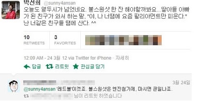 ÀÌ »ç¶÷ Æ®À ½Ç¼ö ÇѰ͵µ ÀÖ¾ú´Âµ¥ "¿À´Ãµµ 12½Ã°¡ ³Ñ¾ú³×¿ä ºÒ½º¿ø¼¦ ÇÑÀÜ ÇØ¾ß ÇÒ±îºÁ¿ä"¿´À½¤»¤»¤»  [7]