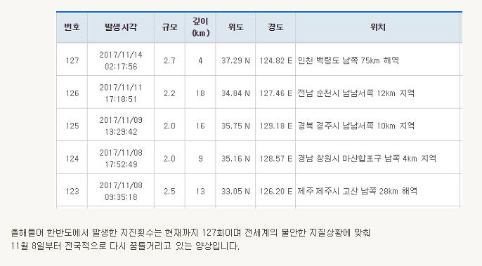 ¿ÃÇØµé¾î Çѹݵµ¿¡¼­ ¹ß»ýÇÑ ÁöÁøÈ½¼ö´Â ÇöÀç±îÁö 127ȸÀ̸ç Àü¼¼°èÀÇ ºÒ¾ÈÇÑ ÁöÁú»óȲ¿¡ ¸ÂÃç