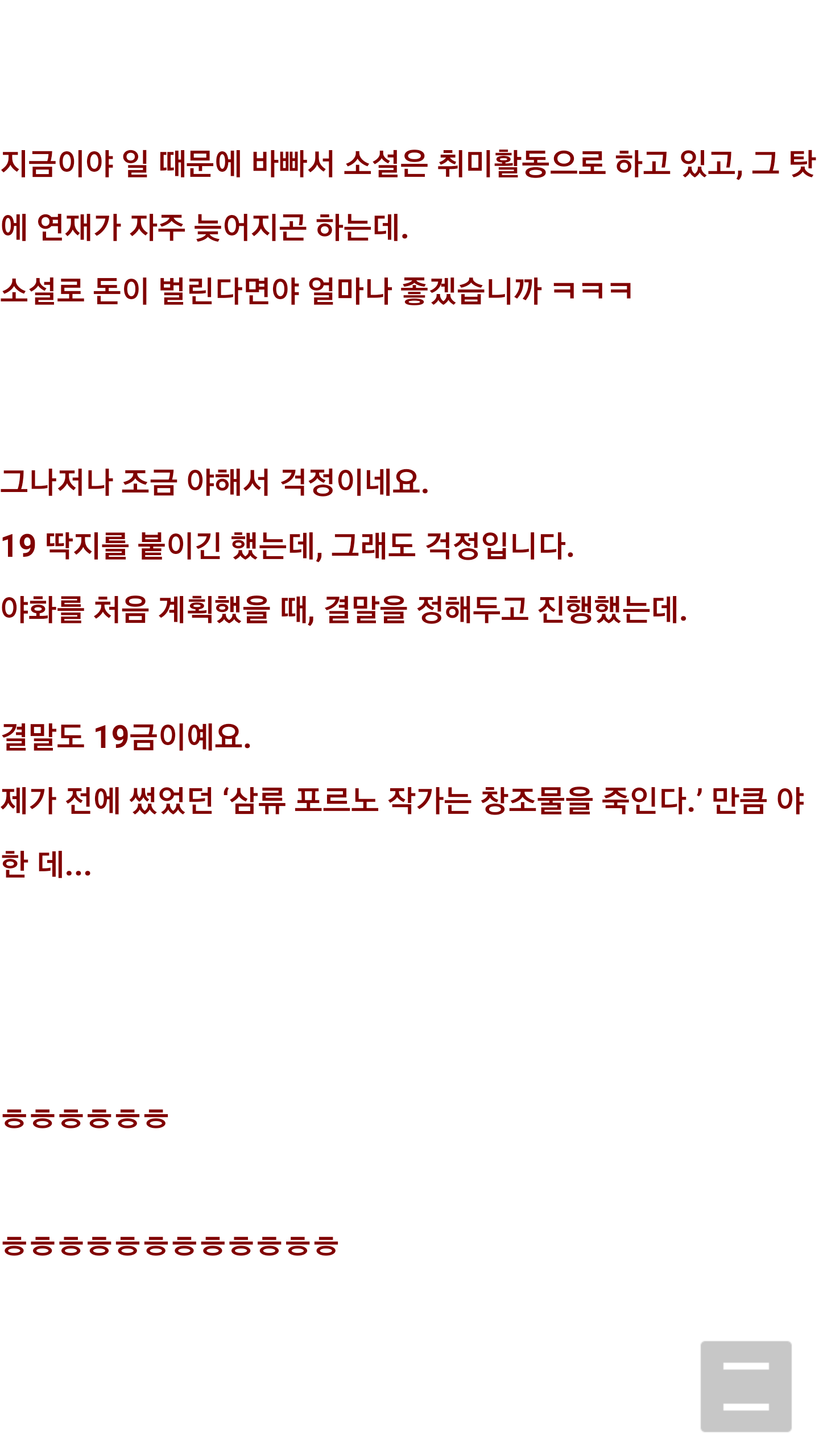 Áö±ÝÀÌ¾ß ÀÏ ¶§¹®¿¡ ¹Ùºü¼ ¼Ò¼³Àº Ãë¹ÌȰµ¿À¸·Î Çϰí ÀÖ°í, ±× Å¿¿¡ ¿¬Àç°¡ ÀÚÁÖ ´Ê¾îÁö°ï Çϴµ¥.