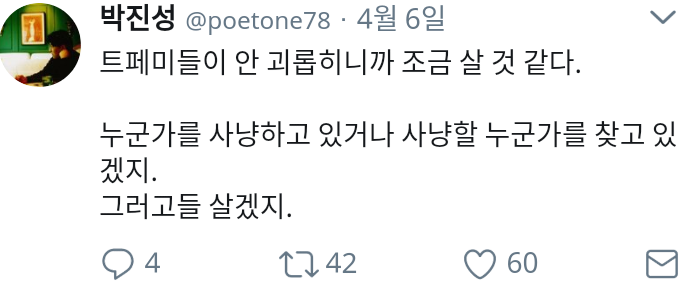 Àü¿¡´Â Æ®À§ÅÍ¿¡¼­ Àú·± ¸»µµ ÇϽŠÀûÀÌ ÀÖ¾ú´Âµ¥, ¿ªÀ¸·Î ¸»ÇÏ¸é ±×µ¿¾ÈÀº »ì¸À ¾È ³¯ Á¤µµ·Î ±«·Î¿ü´Ù´Â ¾ê±â·Î µé·Á¼­ ¾¹¾µÇÏ´õ¶ó.