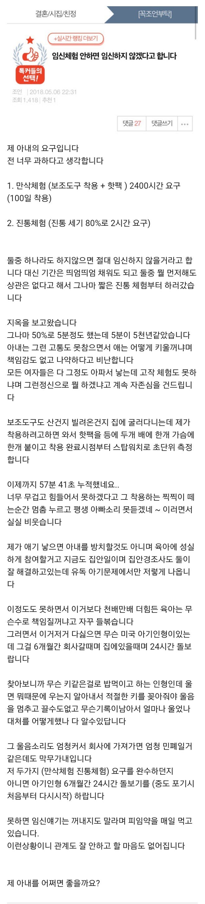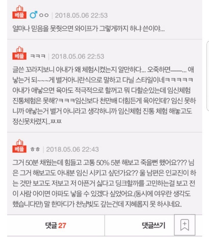ÀÓ½ÅÀ» °¿äÇÏÁö ¾Ê¾Ò´Âµ¥ ¾Æ³»°¡ Àú·¸°Ô ³ª¿Â´Ù? ¾Æ´Ï¶ó°íº½ ¾Ï¹¬ÀûÀ¸·Îµç Á÷Á¢ÀûÀ¸·Îµç ¾Æ±â¸¦ °®ÀÚ´Â ¼³µæÀ» °¡ÀåÇÑ °¿ä¸¦ ÇßÀ»°Å°í ¾Æ³»´Â ÀÓ½ÅÇϱ⠽ȴٴ °£Á¢ÀûÀΠǥÇöÀ¸·Î ÀÓ½ÅüÇèÀ» ÇØº¸¶ó°í ÇßÀ»°ÅÀÓ. ³²ÀÚ´Â °Å±â¼ ¾Æ³»ÀÇ °ÅÀýÀ» ¹Þ¾ÆµéÀÌÁö ¾Ê°í º»ÀÎÀÌ ÀÓ½ÅüÇèÀ» Á÷Á¢ ÇØº½. ÇØº¸°í ³ª¼ Èûµé´Ù´Â°É ±ú´Þ¾ÒÀ½¿¡µµ ¿ÀÈ÷·Á ¾Æ³»¸¦ ÀÌ»óÇÑ »ç¶÷À¸·Î ¸ô°í°¡´Â ±ÛÀ» ÀÛ¼ºÇÔ. ³²ÆíÀÌ ½ÎÀÌÄÚ°¡ ¾Æ´Ï°í¼¾ß ¹«¾ù?... ´ñ±Ûµéµµ ¹«¾ù?..
