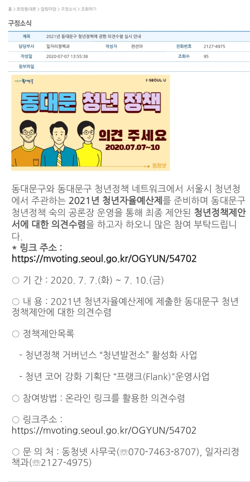 µ¿´ë¹®±¸¿Í µ¿´ë¹®±¸ û³âÁ¤Ã¥ ³×Æ®¿öÅ©¿¡¼ ¼¿ï½Ã û³âû¿¡¼ ÁÖ°üÇÏ´Â 2021³â û³âÀÚÀ²¿¹»êÁ¦¸¦ ÁغñÇÏ¸ç µ¿´ë¹®±¸ û³âÁ¤Ã¥ ¼÷ÀÇ °ø·ÐÀå ¿î¿µÀ» ÅëÇØ ÃÖÁ¾ Á¦¾ÈµÈ û³âÁ¤Ã¥Á¦¾È¼¿¡ ´ëÇÑ Àǰ߼ö·ÅÀ» ÇϰíÀÚ ÇÏ¿À´Ï ¸¹Àº Âü¿© ºÎʵ右´Ï´Ù. * ¸µÅ© ÁÖ¼Ò : https://mvoting.seoul.go.kr/OGYUN/54702 ¡Û ±â °£ : 2020. 7. 7.£¨È£© ~ 7. 10.£¨±Ý£© ¡Û ³» ¿ë : 2021³â û³âÀÚÀ²¿¹»êÁ¦¿¡ Á¦ÃâÇÑ µ¿´ë¹®±¸ û³âÁ¤Ã¥Á¦¾È¿¡ ´ëÇÑ Àǰ߼ö·Å ¡Û Á¤Ã¥Á¦¾È¸ñ·Ï - û³âÁ¤Ã¥ °Å¹ö³Í½º ¡°Ã»³â¹ßÀü¼Ò¡± Ȱ¼ºÈ »ç¾÷ - û³â ÄÚ¾î °È ±âȹ´Ü ¡°ÇÁ·©Å©£¨Flank£©"¿î¿µ»ç¾÷ ¡Û Âü¿©¹æ¹ý : ¿Â¶óÀÎ ¸µÅ©¸¦ Ȱ¿ëÇÑ Àǰ߼ö·Å ¡Û ¸µÅ©ÁÖ¼Ò : https://mvoting.seoul.go.kr/OGYUN/54702 ¡Û ¹® ÀÇ Ã³ : µ¿Ã»³Ý »ç¹«±¹£¨¢Î070-7463-8707£©, ÀÏÀÚ¸®Á¤Ã¥°ú£¨¢Î2127-4975£©