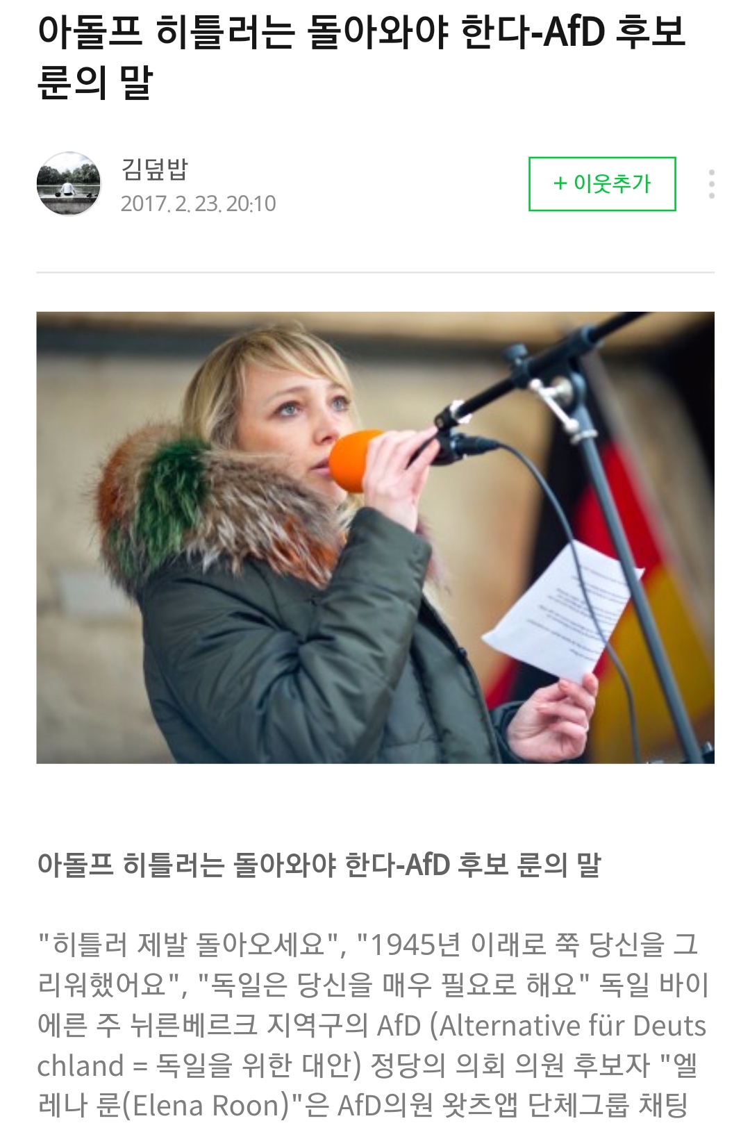 ¾È³çÇϼ¼¿ä. µ¶ÀÏ¿¡¼ °øºÎÁßÀÔ´Ï´Ù AfD´Â ³¹Î¹®Á¦¿Í ¿¬°áÀÌ µÇ¾îÀÖ¾î¿ä (https://m.dw.com/en/afd-files-complaint-against-german-governments-refugee-policy/a-43846703) ±×·¯³ª ÀÌ º»¹®¿¡ Á¦2¾ß´çÀ̶ó°í °Ô½ÃµÈ¹Ù´Â »ç½ÇÀÌ ¾Æ´Õ´Ï´Ù ¹°·Ð 24.9.2017 ÃѼ±¿¡¼ 13.5%ÀÇ µæÇ¥À» ¾ò¾î³»¸é¼ µ¶ÀÏ»çȸ¿¡ Ãæ°ÝÀ» °¡Á®´Ù ÁØ °ÍÀº »ç½ÇÀÔ´Ï´Ù¸¸ ¿©ÀüÈ÷ ¸¶À̳ÊÇÑ ÀǰßÀ̶ó°í ¿©°ÜÁø´Ù°í º¾´Ï´Ù
