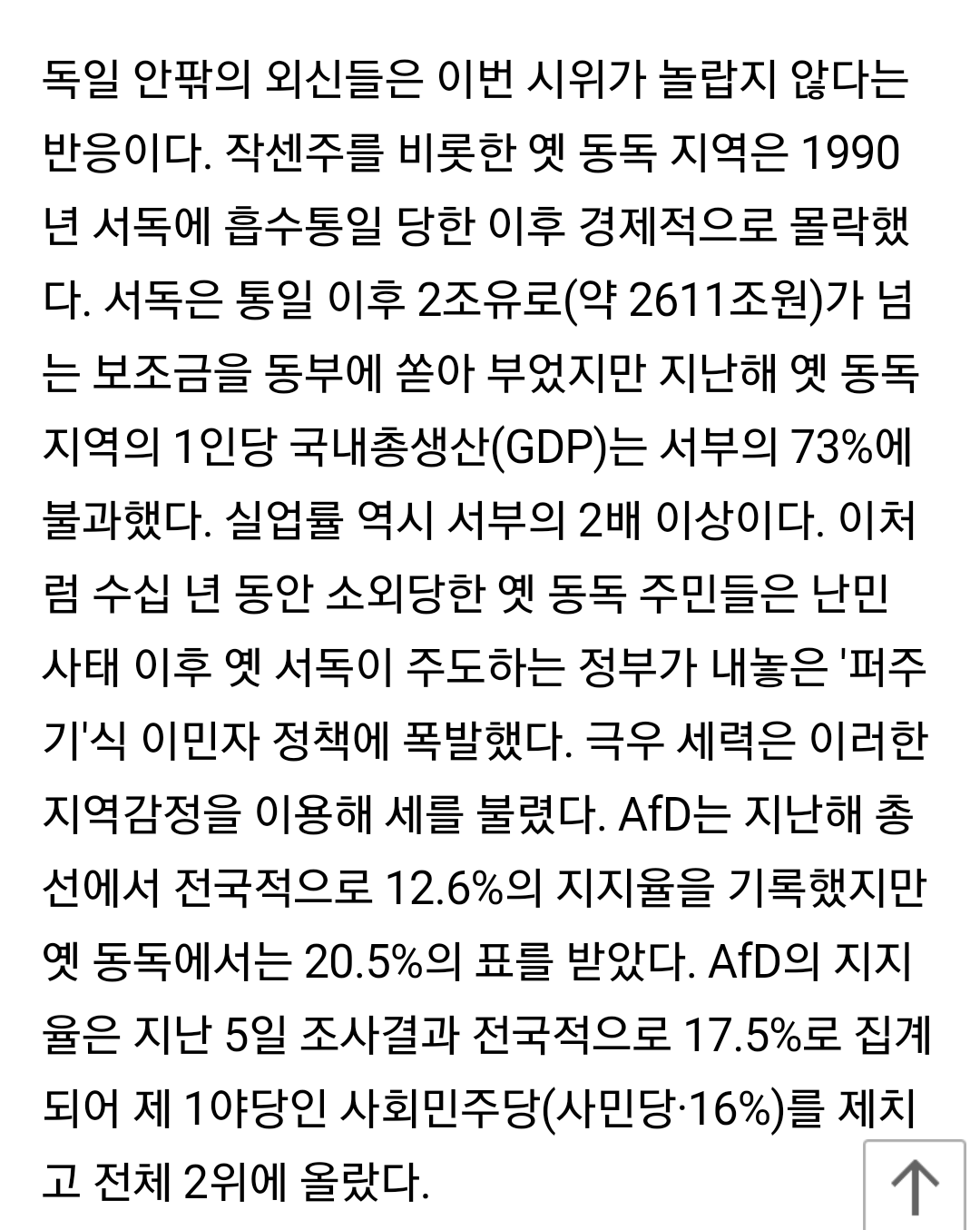 ¸»ÇÏÀÚ¸é µ¶ÀÏÀÇ Çö½ÇÀº Çѱ¹ÀÇ ¾ð·ÐÀÌ º¸¿©ÁÖ°í½Í¾îÇÏ´Â °Í¸¸Å ÀÚ±ØÀûÀÌÁö ¾Ê½À´Ï´Ù. Á¦ ÀǰßÀ¸·Î´Â AfD°¡ µ¿µ¶¿¡¼´Â »ý°¢º¸´Ù ÁöÁöÀ²ÀÌ ³ôÀ»Áö¶óµµ µ¿µ¶¿¡¼Á¶Â÷ ¸ÞÀÌÀúÇÑ ÀǰßÀº ¾Æ´Õ´Ï´Ù. Àü±¹ ÁöÁöÀ²¿¡¼ grand coalitionÀ» ¾ÐµµÇϴ°ÍÀº ºÒ°¡´ÉÇÕ´Ï´Ù. ÀϺΠµ¿µ¶Ãâ½ÅÀÇ µ¶ÀÏÀεéÀÌ ¸¹Àº ¹Ý°¨À» °®´Â´Ù ÇÏ´õ¶óµµ ´ë´Ù¼ö µ¶ÀÏÀεéÀº ±×·¯ÇÑ ¹èŸÀûÀÎŵµ°¡ ÆÄ½ÃÁòÀ¸·Î º¯ÇÏÁö ¾Êµµ·Ï ±³À°À» ¹Þ¾Æ¿Ô½À´Ï´Ù