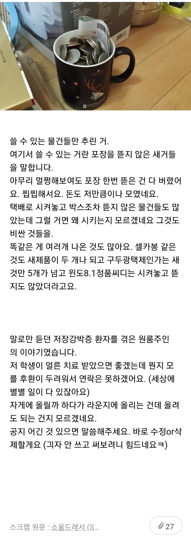 ³ª´Â Åùè¹Ú½º³ª ½Å¹ß»óÀÚ µîµî ÀÖÀ¸¸é ¾ðÁ¨°¡ ¾²°ÚÁöÇϰí ÇÑ ÂÊ¿¡ ¸ð¾ÆµÎ´Âµ¥ À̰͵µ ¾à°£ ÀúÀå°¹ÚÀΰ¡..? ¾Æ¹öÁöµµ °ø±¸ ºÎ¼Óǰ°°Àº °ÍµéÀº ³ª ¾î·ÈÀ» ¶§ºÎÅÍ Áö±Ý±îÁö °è¼Ó ¸ð¾ÆµÎ½Ã±ä Çߴµ¥ ½ÇÁ¦·Î ÇÊ¿äÇÒ ¶§ ã¾Æ ¾²½É ±× ¿Ü¿¡´Â ¸ð¾ÆµÎ´Â °Ç ¾øÀ½ ¾Æ´Ô ¾ö¸¶°¡ Åù踦 ÀÚÁÖº¸³»¼Å¼(¹ÝÂù°°Àº°Å °¡Á·µéÇÑÅ×) ¹Ú½º »ç´Â µ· ¾Æ³¢·Á°í ¸ð¾ÆµÎ½Ã´Â °Å¿¡ ¿µÇâÀ» ¹ÞÀº°Ç°¡ ½Í³×
