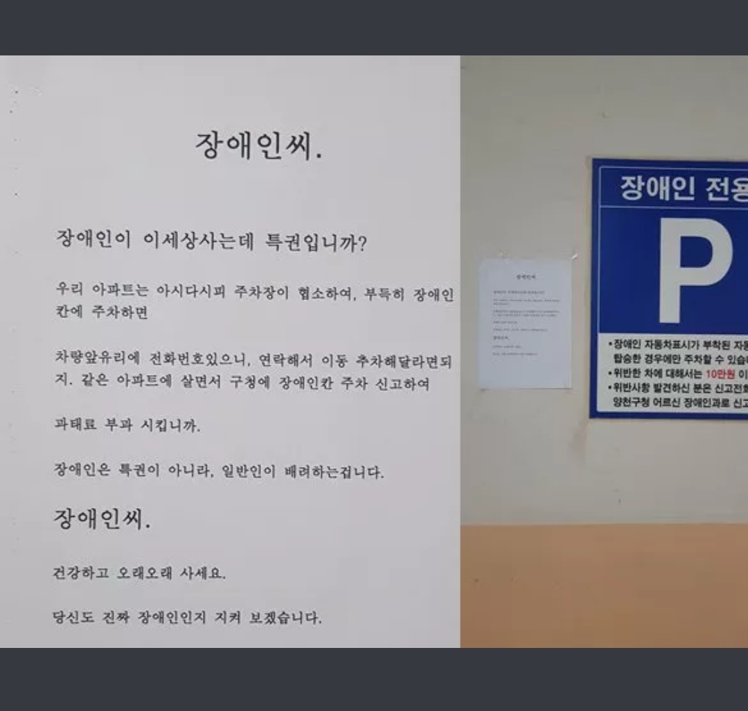 ÀÚ±âÀڽŵµ Àå¾ÖÀÎÀ̶ó¼ Àå¾ÖÀÎ ÁÖÂ÷Ä¿¡ Â÷¸¦ ´í°ÍÀÌ Á¤´çÇϴٴ°ÍÀ» ¾îÇÊÇϰí ÀÖ´Â°Ô ¾Æ´Ò±î?