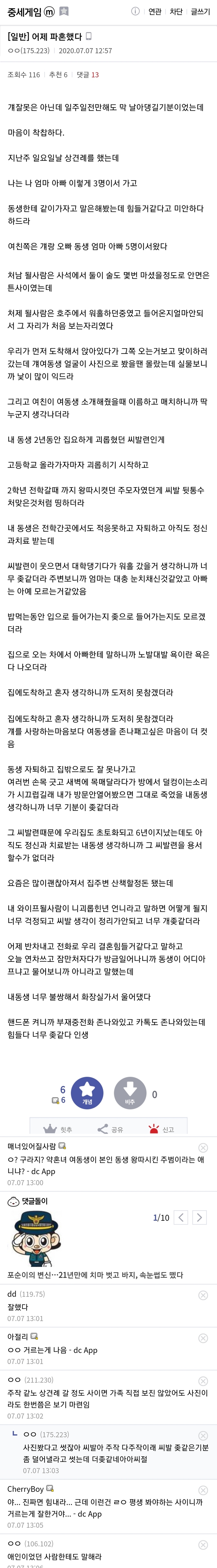 ³ª¶ó¸é Àú °áÈ¥ Àý´ë ¸øÇØ. ±×¸®°í »ç½Ç ±×´ë·Î ¸»Çϰí Çì¾îÁú °Í °°´Ù. ´Ï µ¿»ýÀÌ ³» µ¿»ý Àλý Á¶Á®³ù´Ù°í. ¹°·Ð ¿¬ÀÎÀÇ À߸øÀº ¾ø´Â°É ¾ËÁö¸¸ ±×·¸´Ù°í ³»°¡ ±× »ç¿¬À» È¥ÀÚ ¹¯°í »ì¾Æ°¡·Á¸é ½º½º·Î ³Ê¹« ȳª¼ Á¦ ¸í¿¡ ¸ø Á×À»°Í°°À½